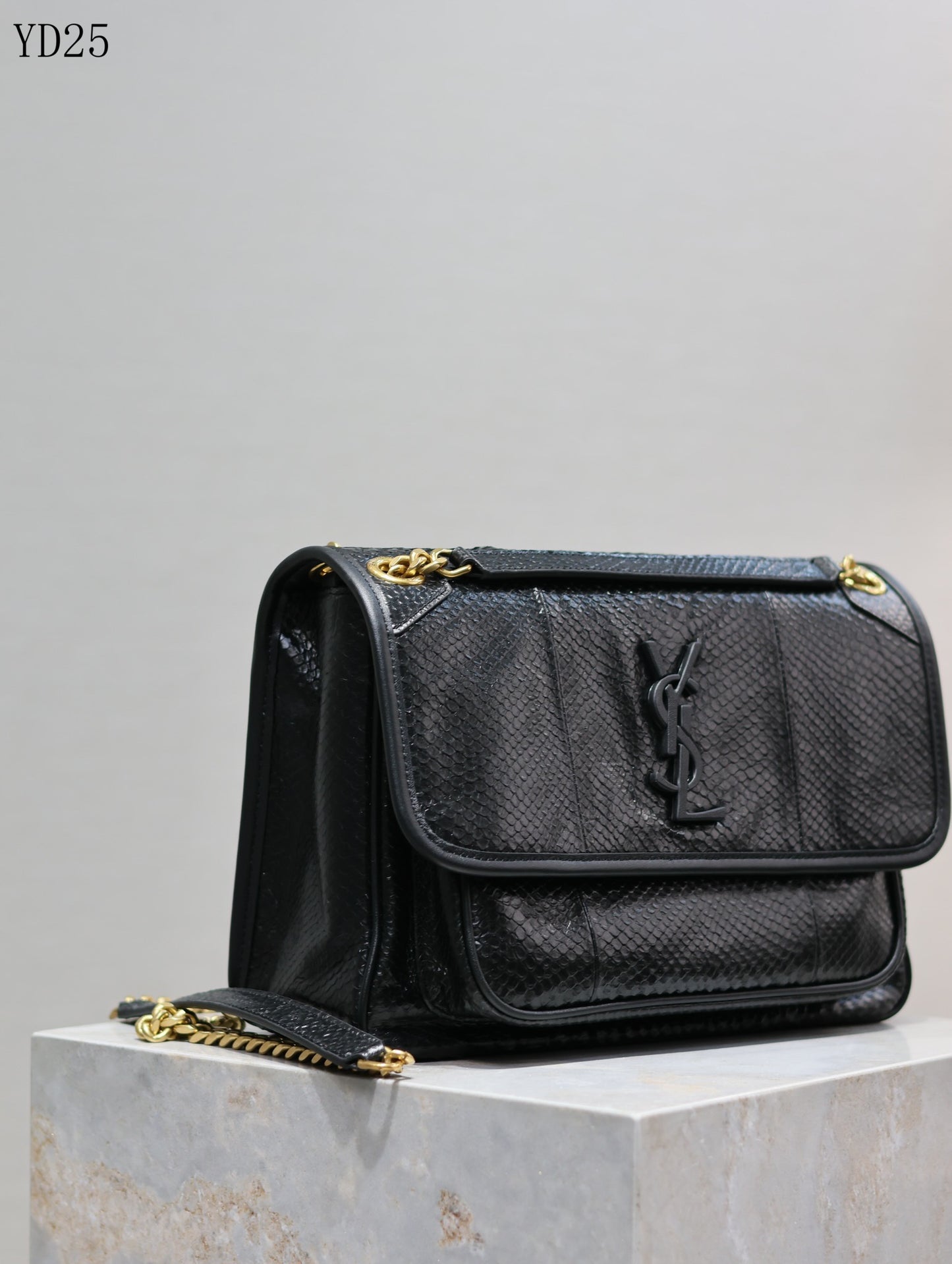 Hardware: Polished gold-tone YSL logo and chain strap