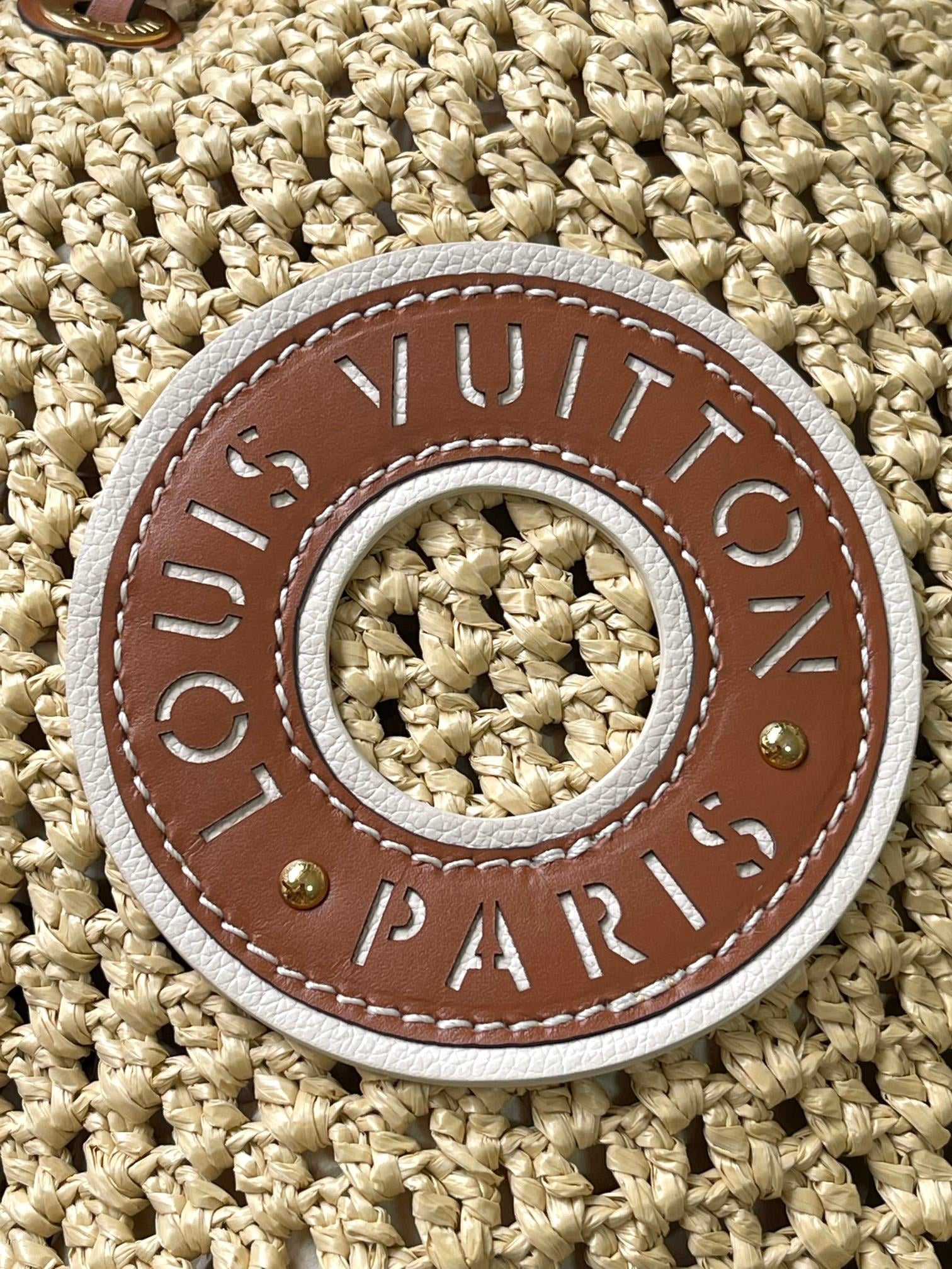 This elegant Louis Vuitton Noé bucket bag features a handwoven raffia construction, trimmed with smooth leather and detailed with the iconic Louis Vuitton Paris logo patch. Its versatile drawstring closure adds both charm and practicality, making it the perfect summer companion for chic outings, weekend getaways, or everyday elegance.