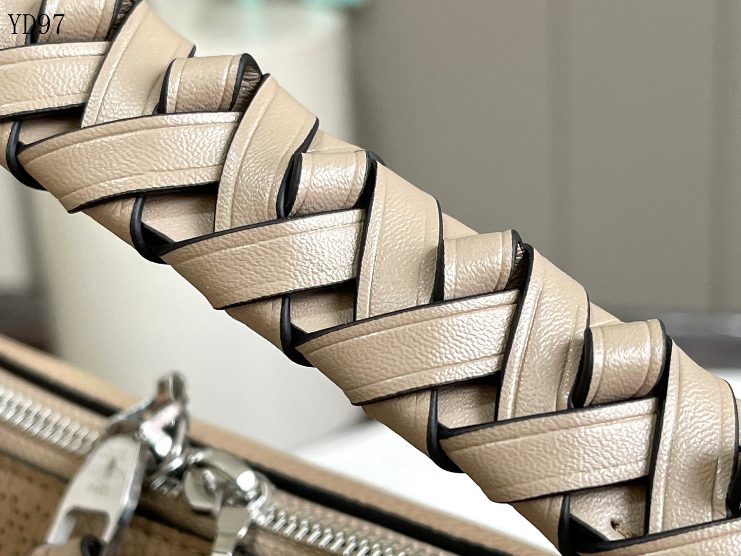 Intricately hand-braided leather top handle with smooth edge finishing