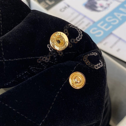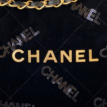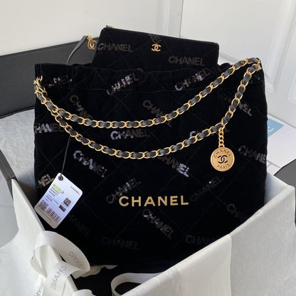 The Chanel 22 Handbag is a statement piece that combines modern elegance with everyday practicality. Crafted in plush black velvet, this luxurious bag showcases gold-tone hardware, including the iconic CHANEL lettering and medallion charm, offering a sophisticated yet contemporary allure.