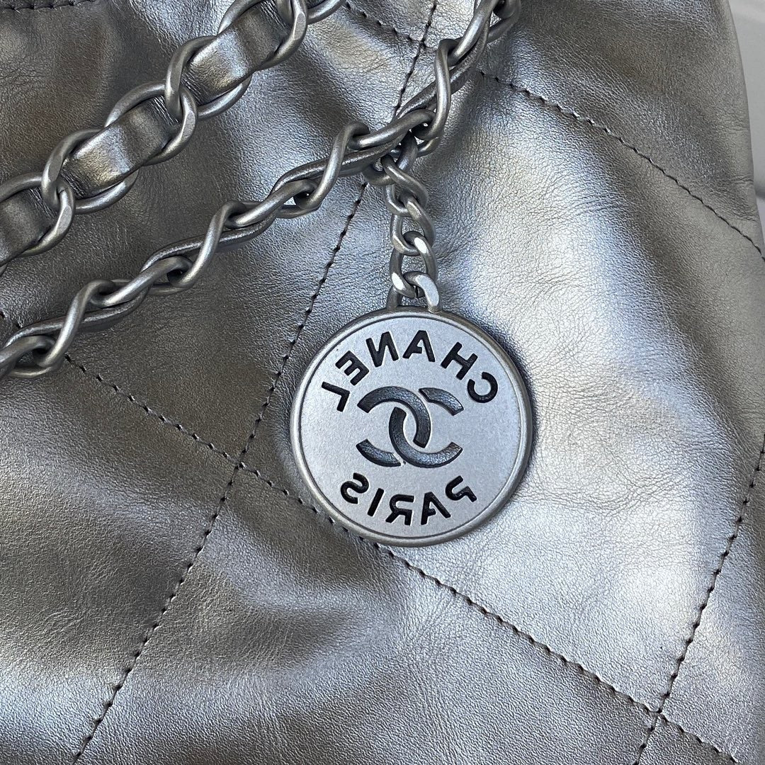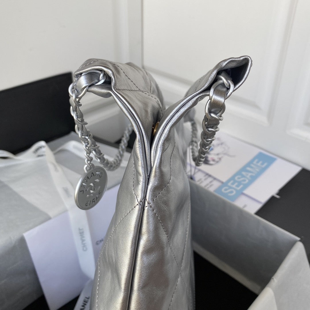Bold, modern, and effortlessly chic—the Chanel 22 Handbag in metallic silver lambskin leather is a statement piece designed for those who love contemporary luxury. Featuring the iconic diamond-quilted pattern, silver-tone hardware, and the signature Chanel Paris medallion charm, this bag exudes sophistication with a futuristic edge. The drawstring closure provides both security and ease of access, making it a perfect blend of fashion and functionality.