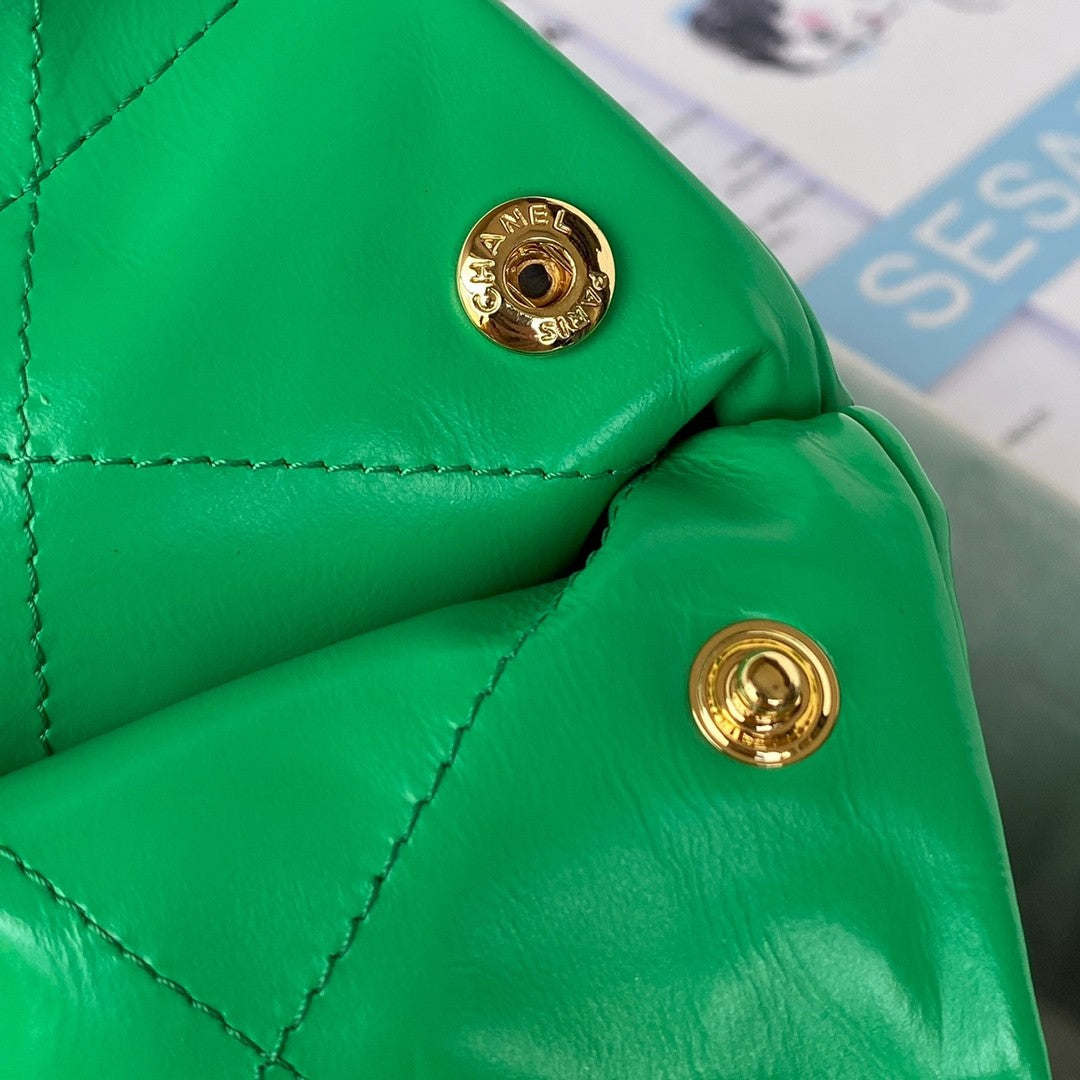 Make a bold fashion statement with the Chanel 22 Handbag in vibrant green lambskin leather. This eye-catching piece combines luxurious craftsmanship with a modern, relaxed silhouette, featuring the iconic diamond-quilted pattern, gold-tone hardware, and a signature Chanel Paris medallion charm. Designed for both style and functionality, its spacious interior and lightweight feel make it the perfect everyday luxury companion.