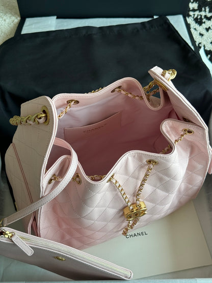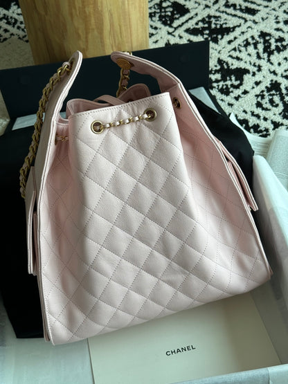 A bold yet feminine statement — the Chanel 25 Large Handbag in pink quilted leather with gold-tone metal is designed for those who want luxury with practicality. Its oversized silhouette, iconic quilting, and chain drawstring closure make it both functional and undeniably chic.