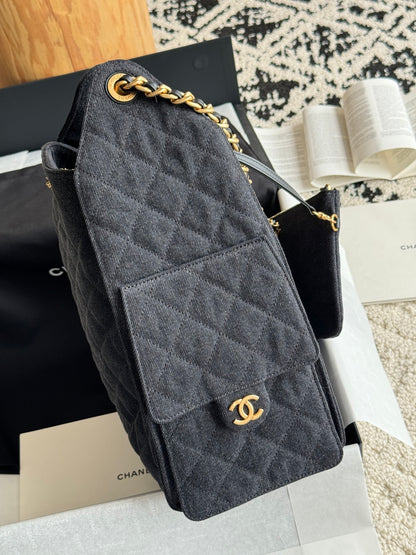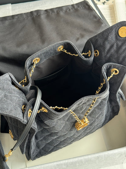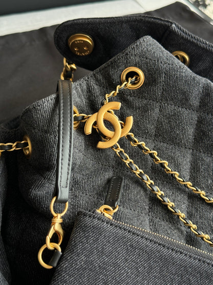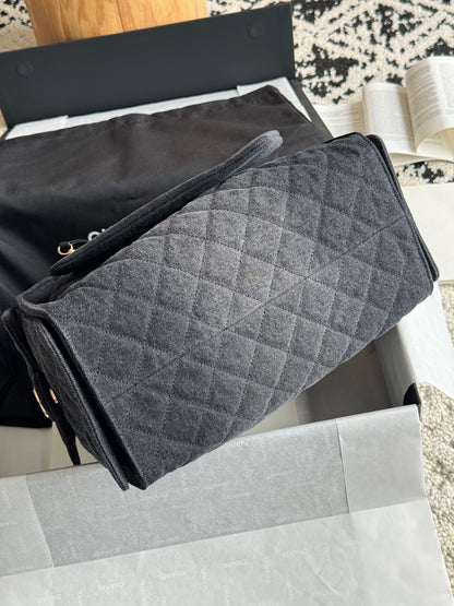 The Chanel 25 Large Handbag in dark grey denim is a statement piece that blends casual chic with timeless luxury. Its oversized structure makes it practical for everyday use, while the quilted denim and gold accents ensure it remains unmistakably Chanel.