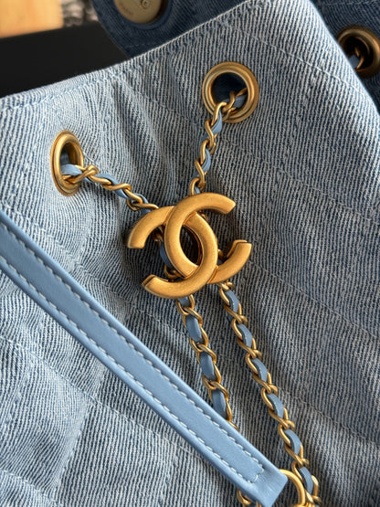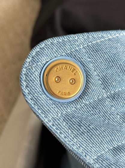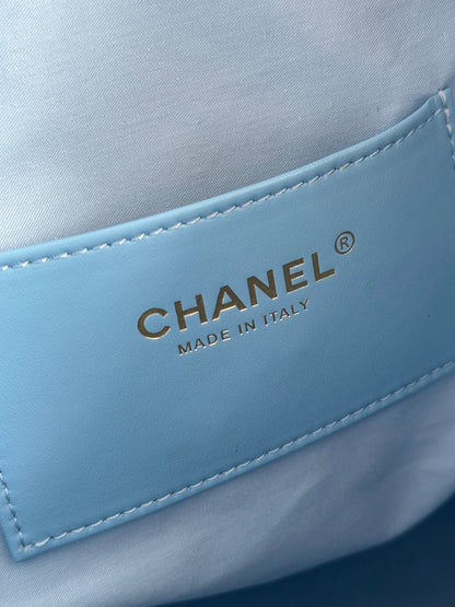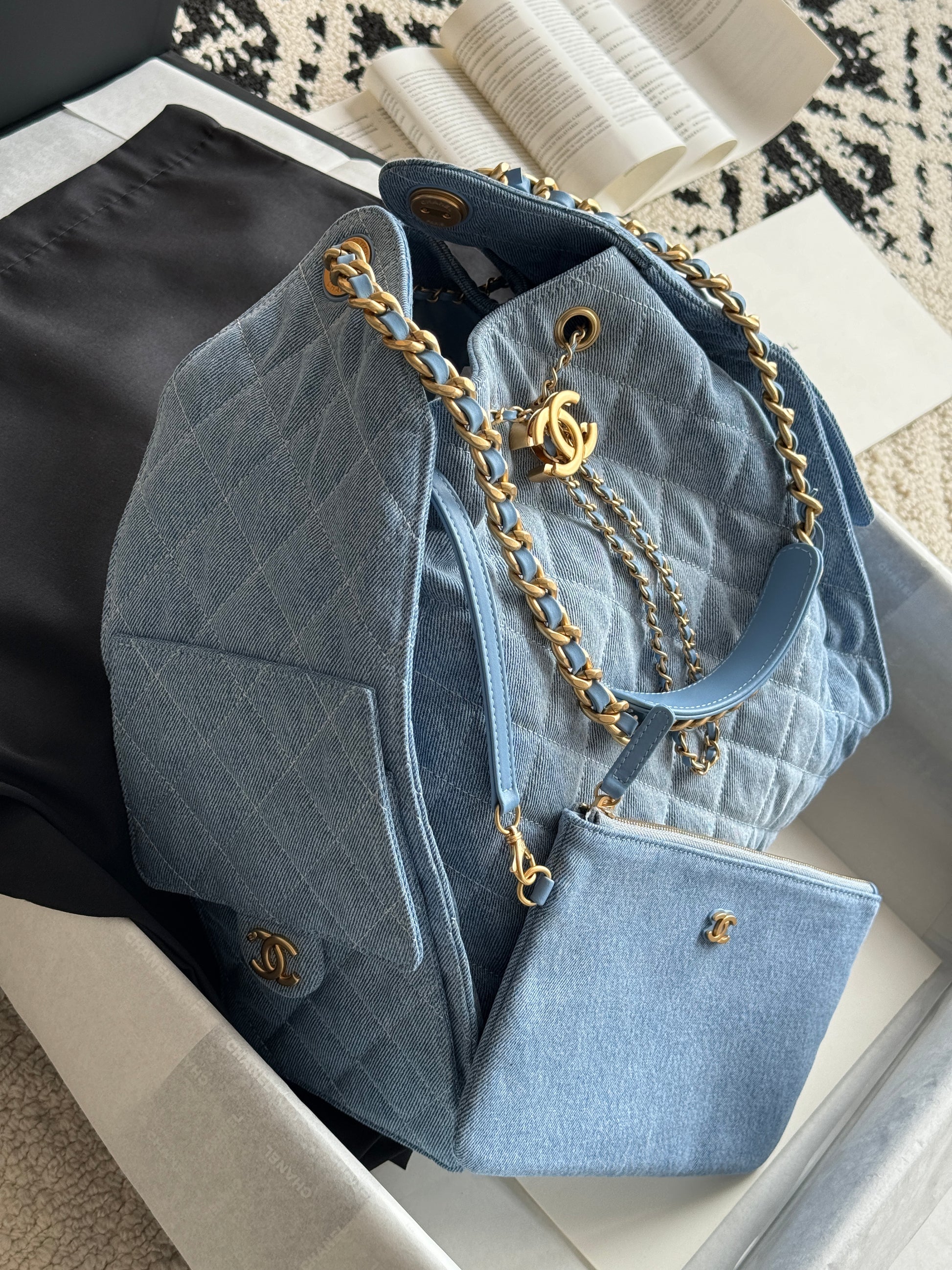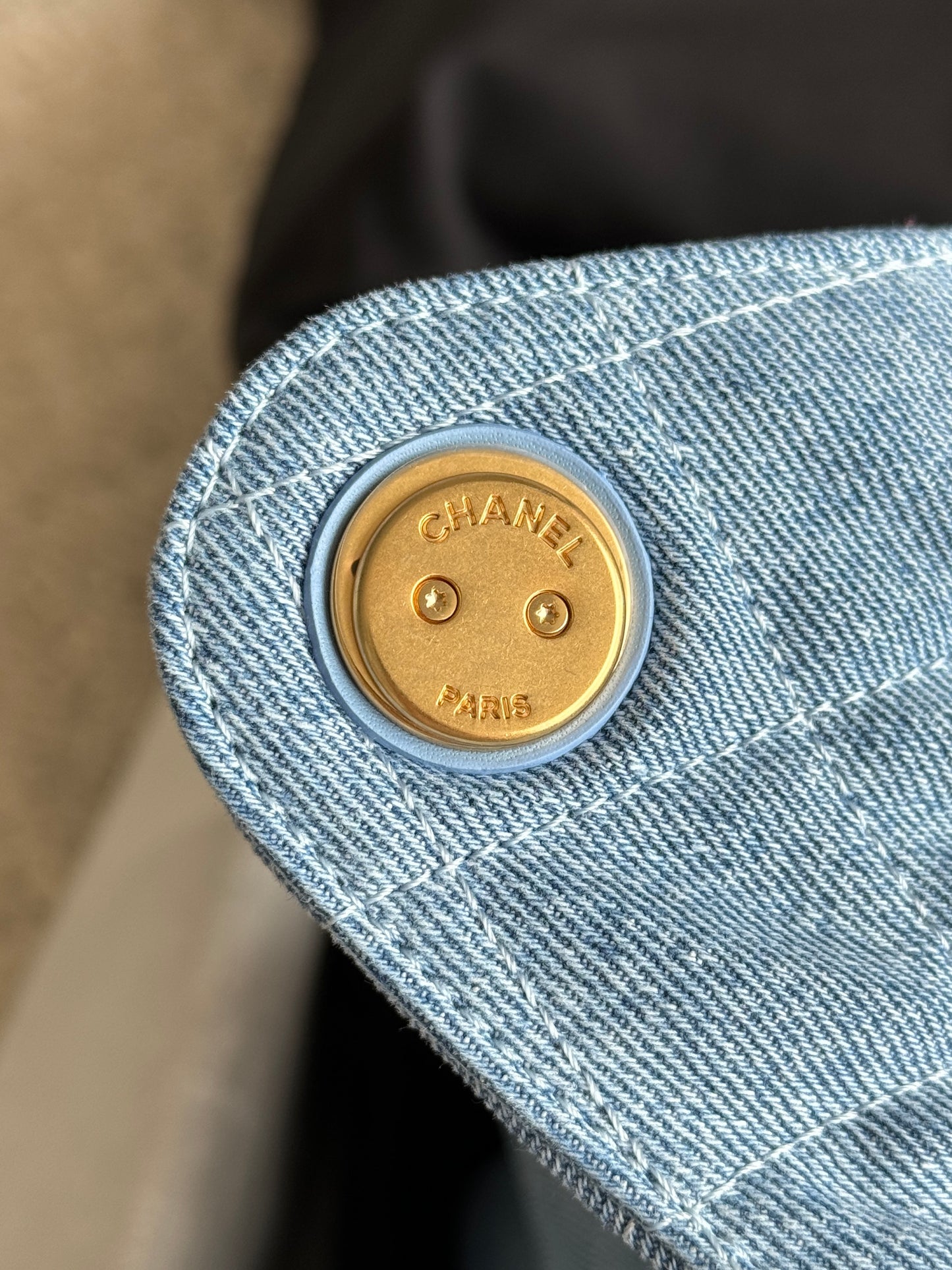 The Chanel 25 Large Handbag in light blue denim combines laid-back elegance with Chanel’s timeless design. Its oversized shape makes it practical for daily use, while the fresh blue shade and gold details make it a standout statement piece.