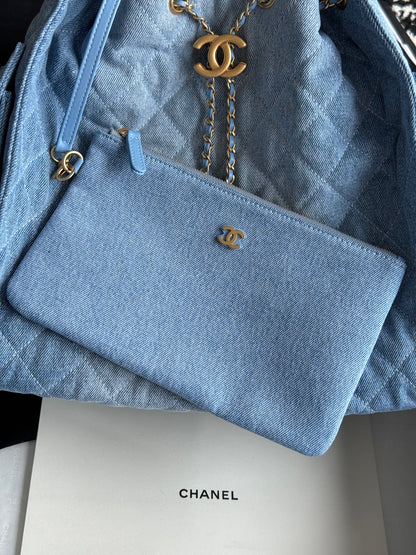 The Chanel 25 Large Handbag in light blue quilted denim with gold-tone metal is a refreshing interpretation of a Chanel classic. With its oversized silhouette, soft denim body, and detachable matching pouch, this handbag brings together casual charm and timeless sophistication.