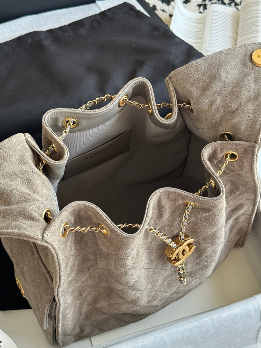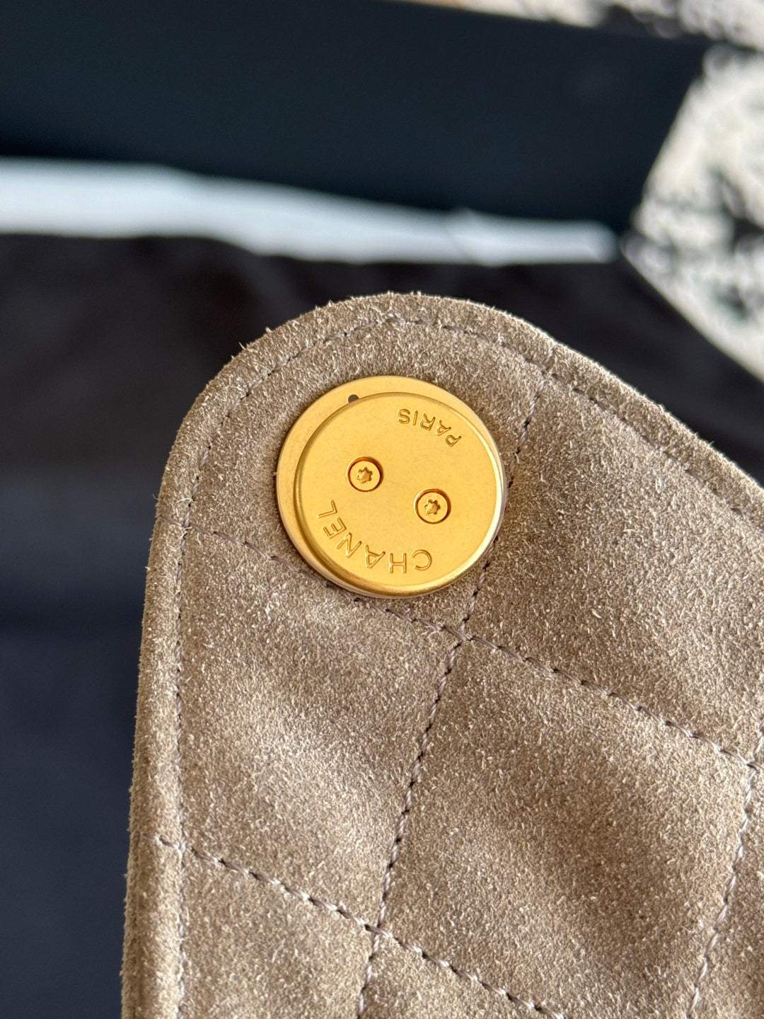 The Chanel 25 Large Handbag in taupe suede with gold-tone metal is the epitome of understated luxury. Its oversized silhouette, combined with the soft suede texture and radiant gold accents, makes it both practical and irresistibly elegant. Perfect for everyday sophistication or travel-ready chic.