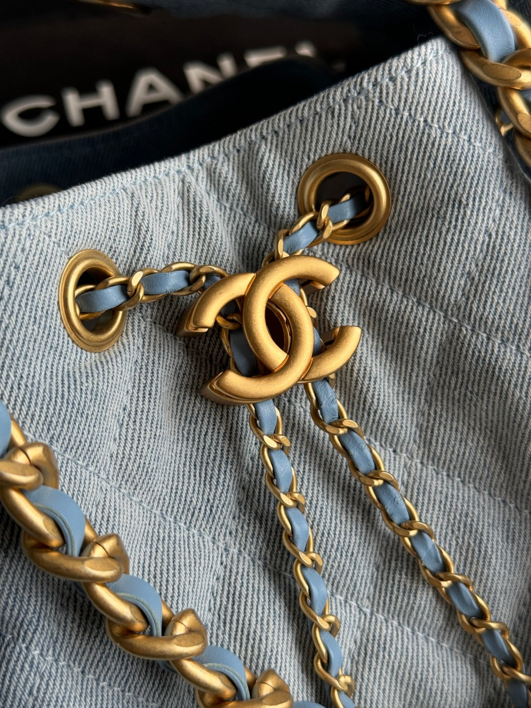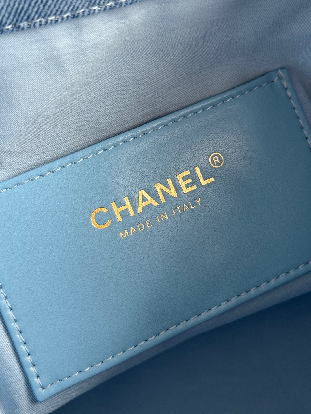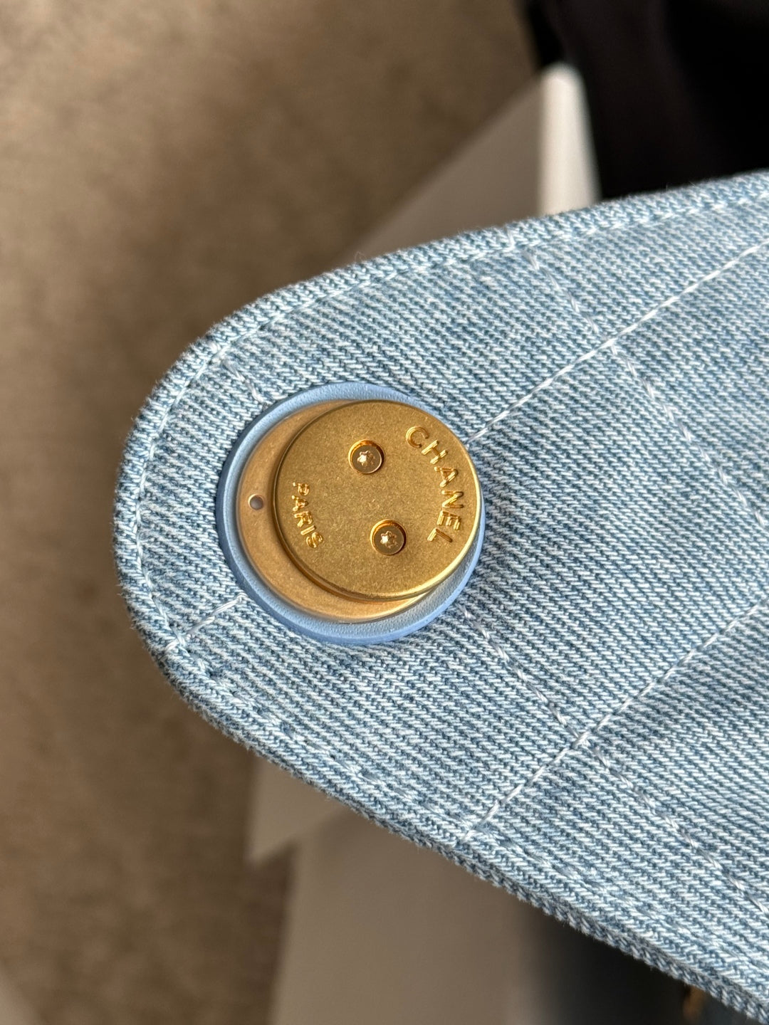 The Chanel 25 Medium Handbag in blue quilted denim with gold-tone metal is a modern twist on a timeless classic. Its lightweight denim body and luxurious gold accents create a chic yet casual look, making it versatile for both daytime outings and evening wear.