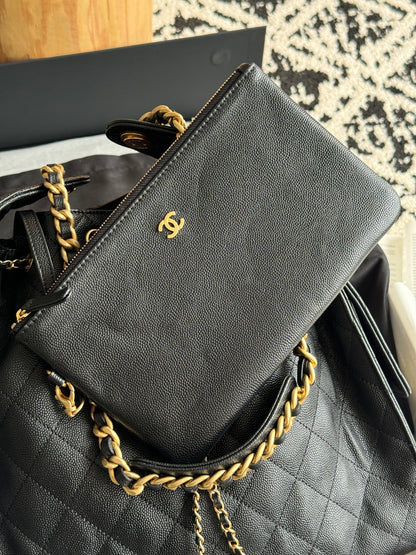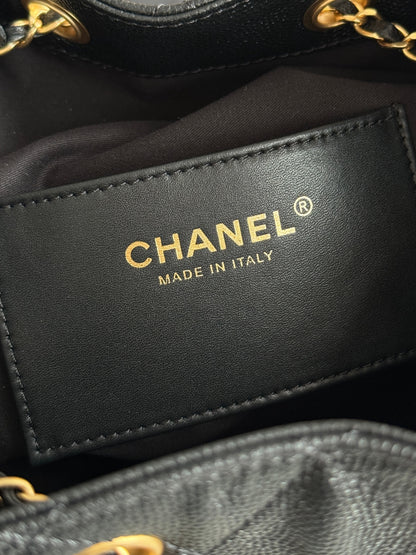 Hardware: Signature gold-tone CC charm and chain-threaded drawstring closure