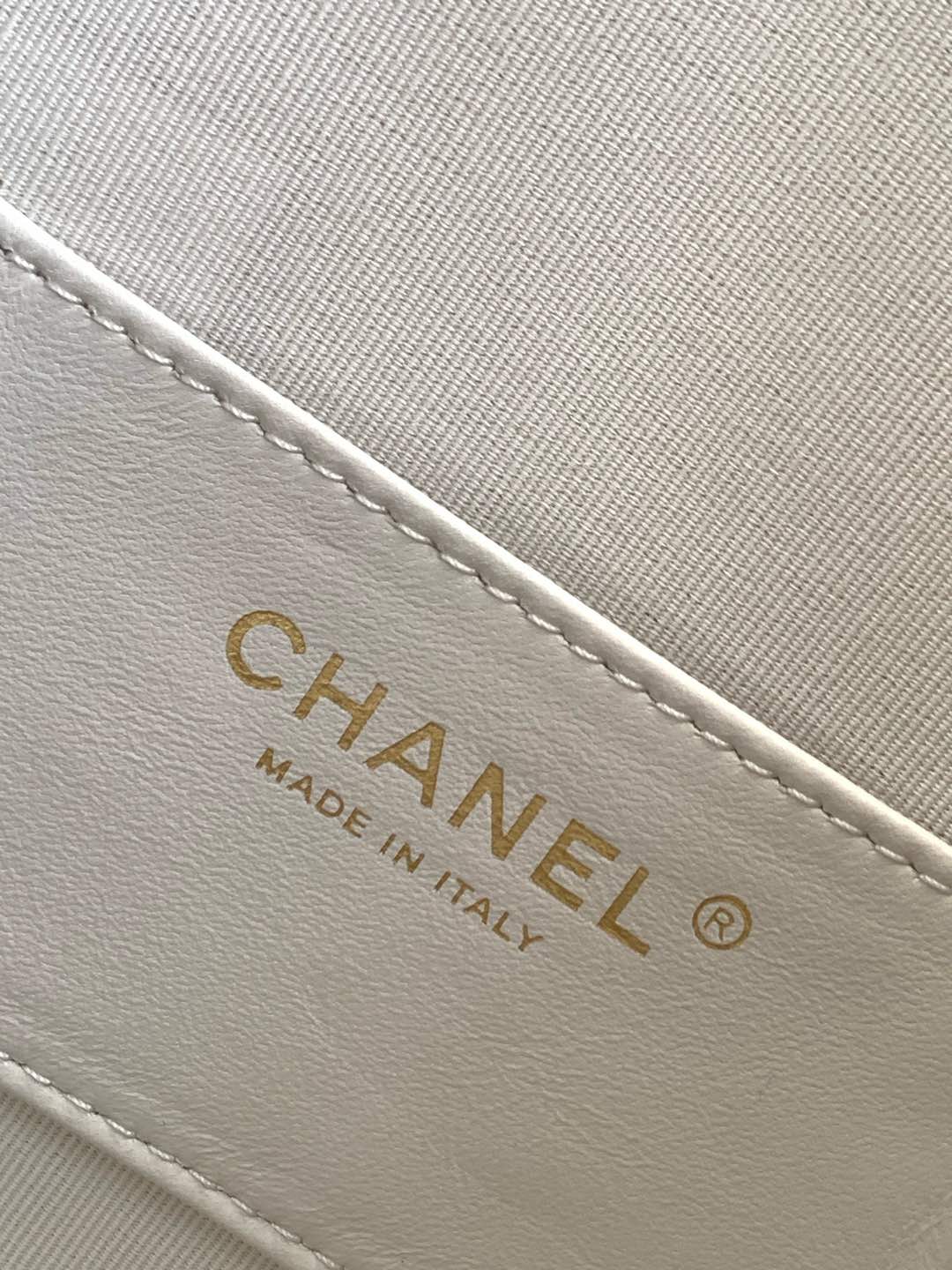 Iconic CC turn-lock closure and chain-drawstring detail for that unmistakable luxury touch.