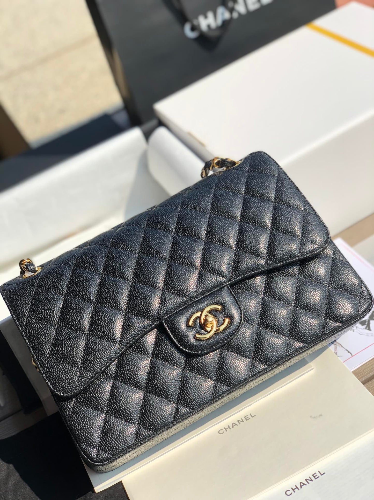 Timelessly elegant and unmistakably iconic, the Chanel 2.55 Large Classic Flap Bag is a statement of sophistication and enduring style. Crafted from luxurious black caviar leather and finished with gleaming gold-tone hardware, this bag elevates every outfit—from everyday elegance to evening glamour.
