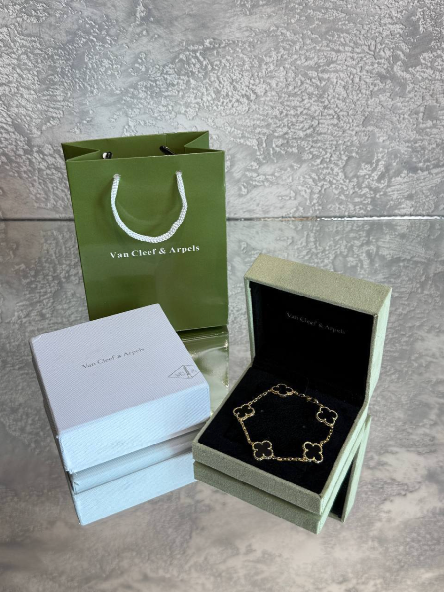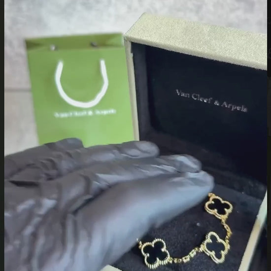 Timeless elegance meets modern sophistication with this Vintage Alhambra-style bracelet. Featuring five black onyx clover motifs set on a finely crafted gold-plated chain, it delivers a sleek and luxurious look. Perfect for both everyday wear and evening occasions, this bracelet is a refined addition to any jewelry collection.
