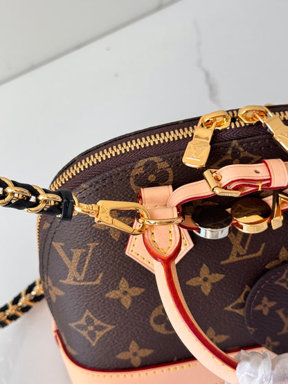 The Louis Vuitton Alma BB in white Monogram canvas is a refined and modern take on the timeless Alma silhouette. Enhanced with a bold Monogram heart charm and gold chain detail, this compact bag perfectly blends classic LV elegance with a playful, contemporary touch.