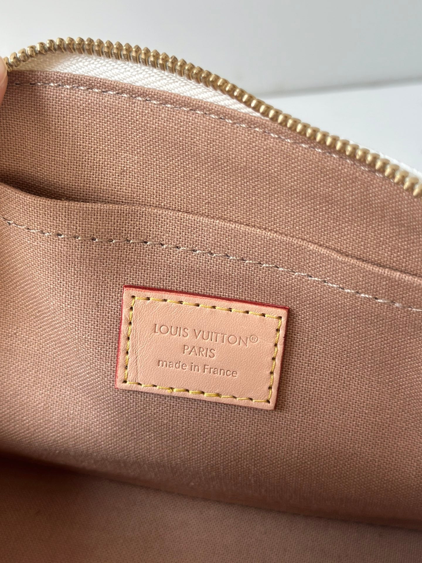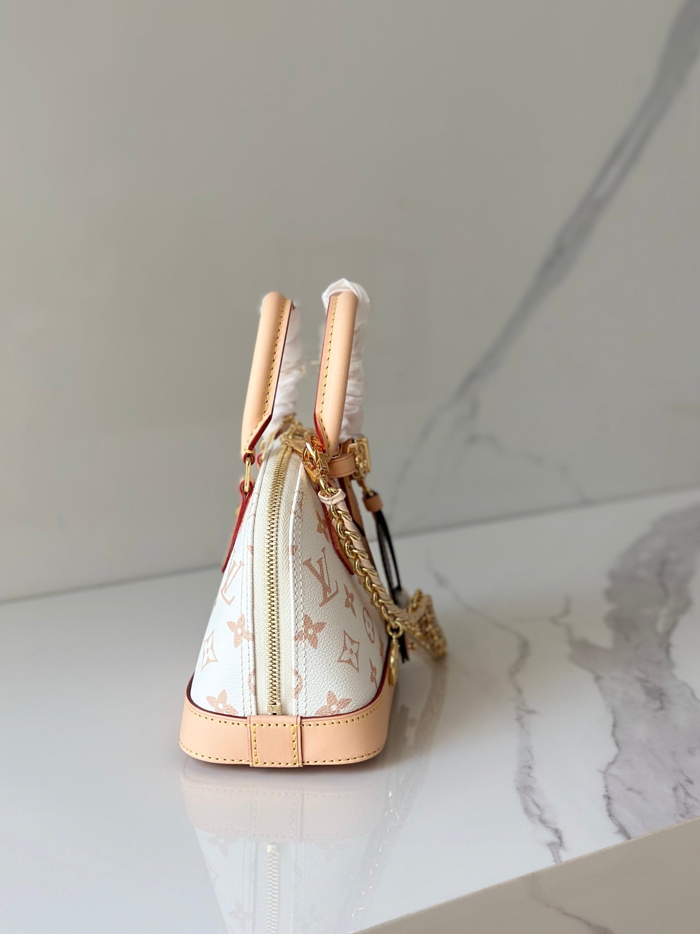 The Louis Vuitton Alma BB in white Monogram canvas is a refined and modern take on the timeless Alma silhouette. Enhanced with a bold Monogram heart charm and gold chain detail, this compact bag perfectly blends classic LV elegance with a playful, contemporary touch.