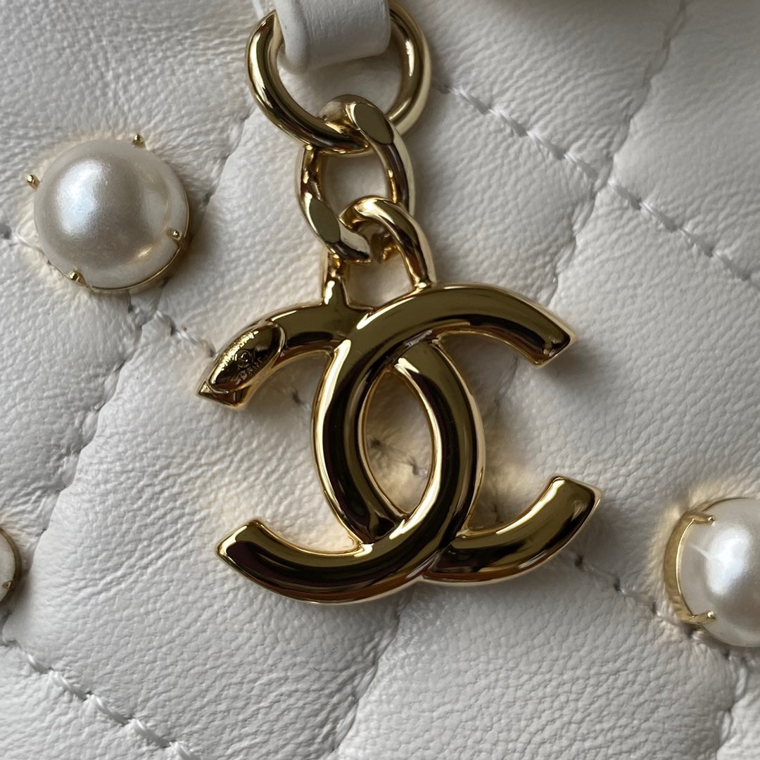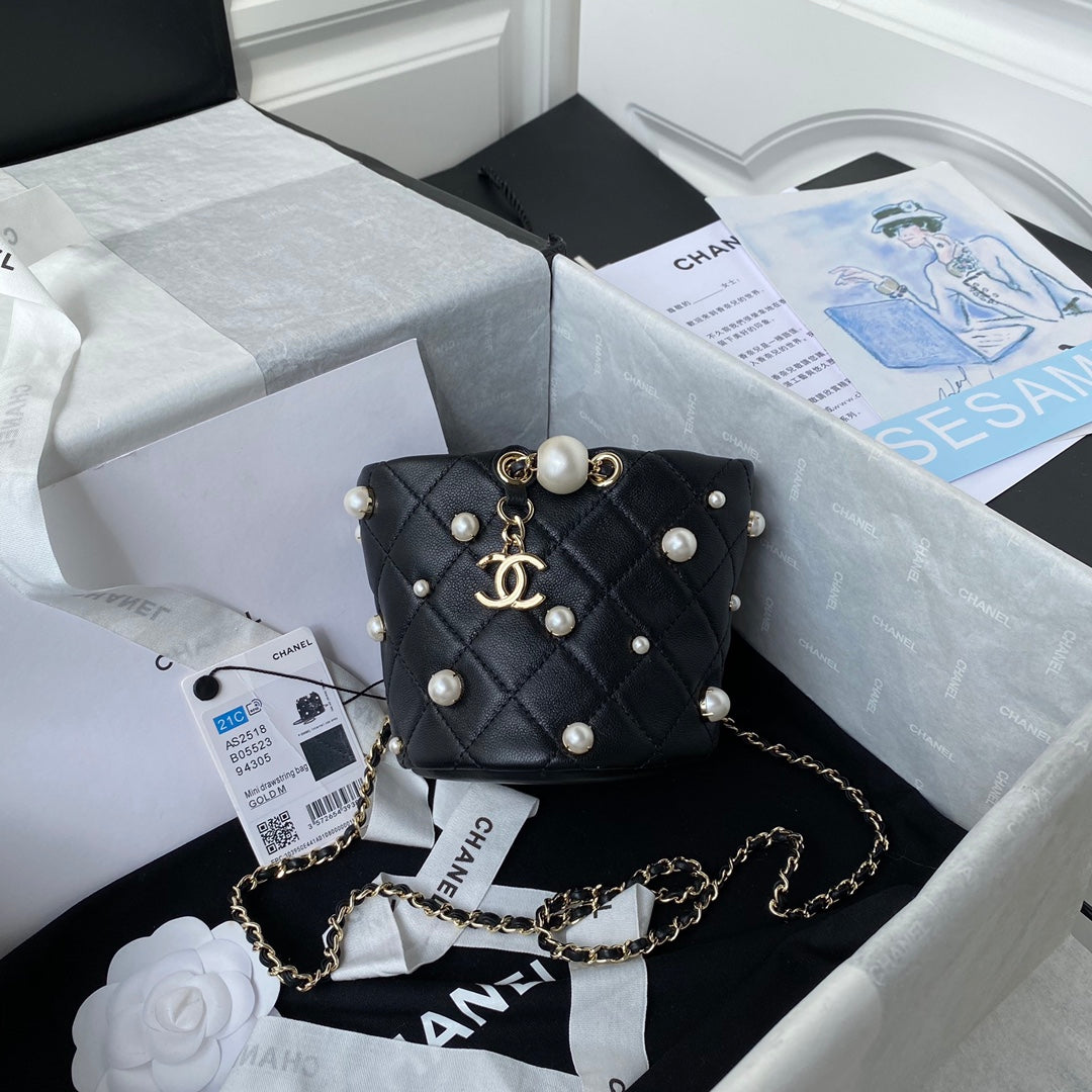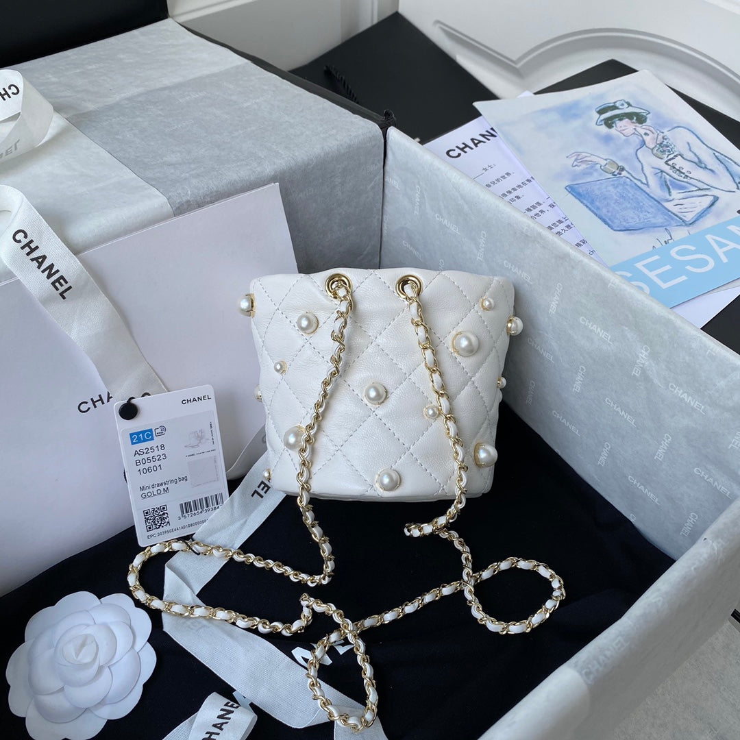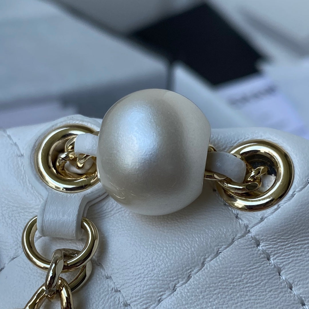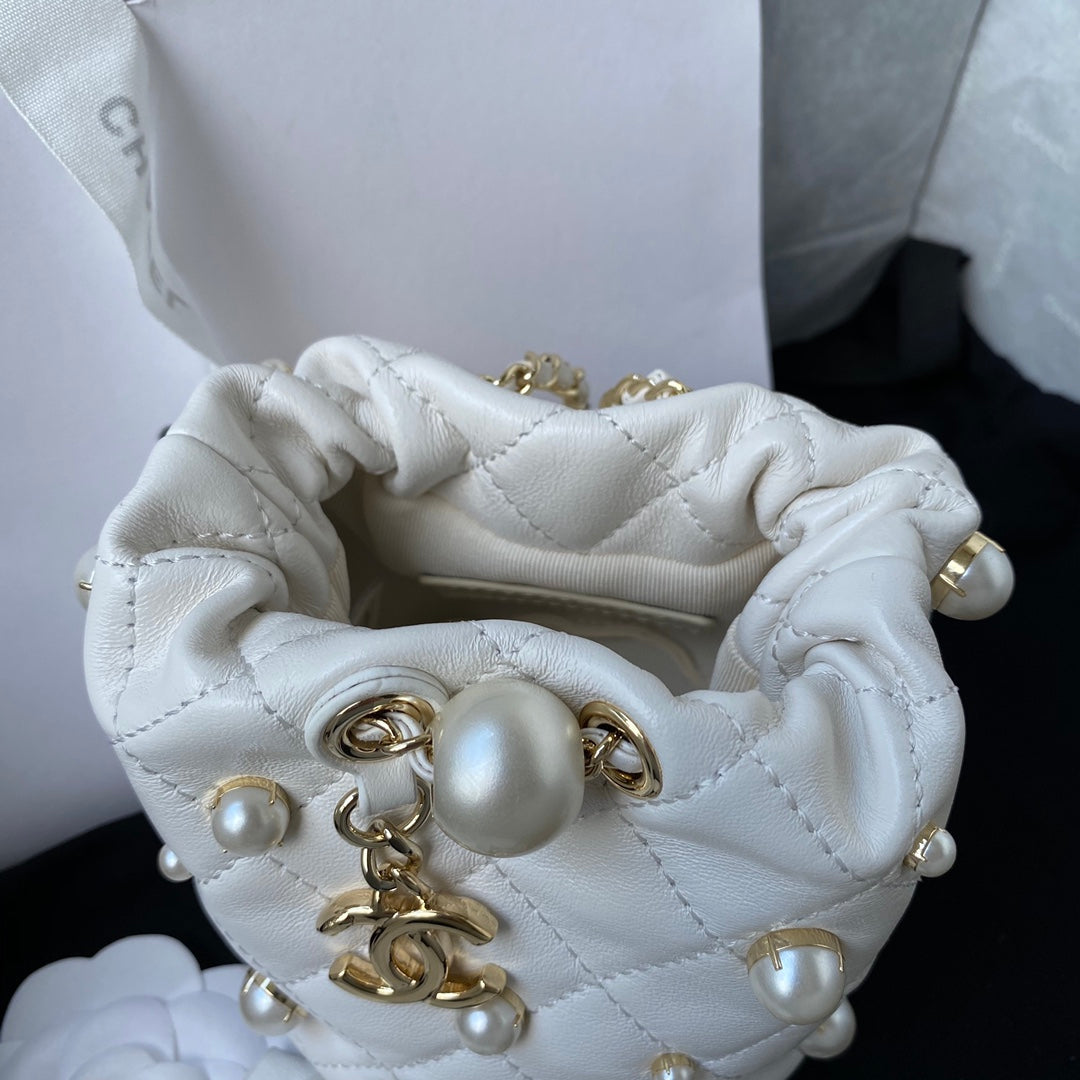 A delicate and refined Chanel Mini Drawstring Bag, adorned with elegant pearls for a sophisticated and feminine touch. Designed for those who appreciate fine craftsmanship and timeless style.