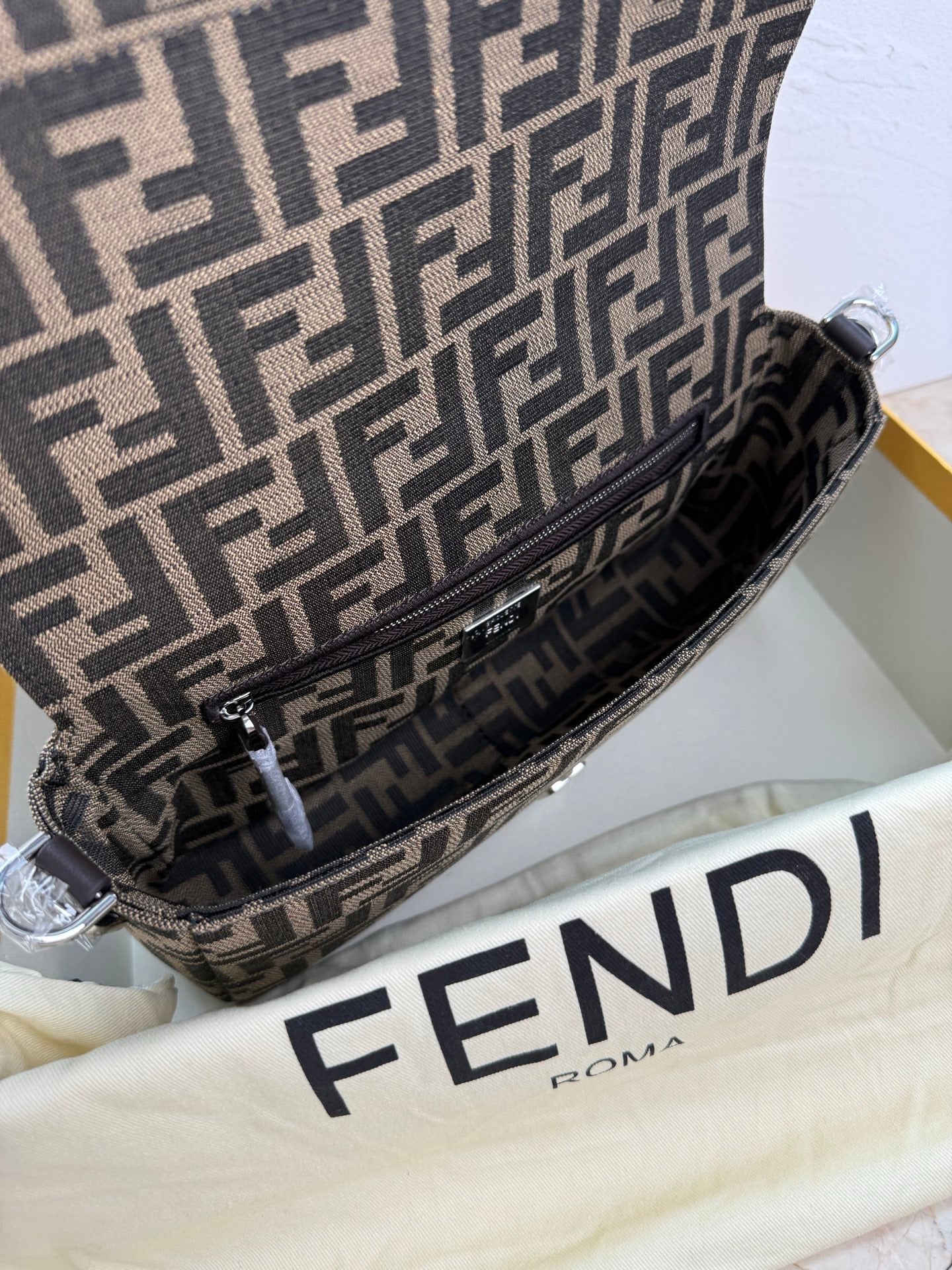 Expertly crafted in Italy, the Baguette features the iconic FF canvas paired with leather details and silver-tone hardware. Its magnetic flap closure ensures easy access, while the adjustable strap allows both shoulder and crossbody styling.