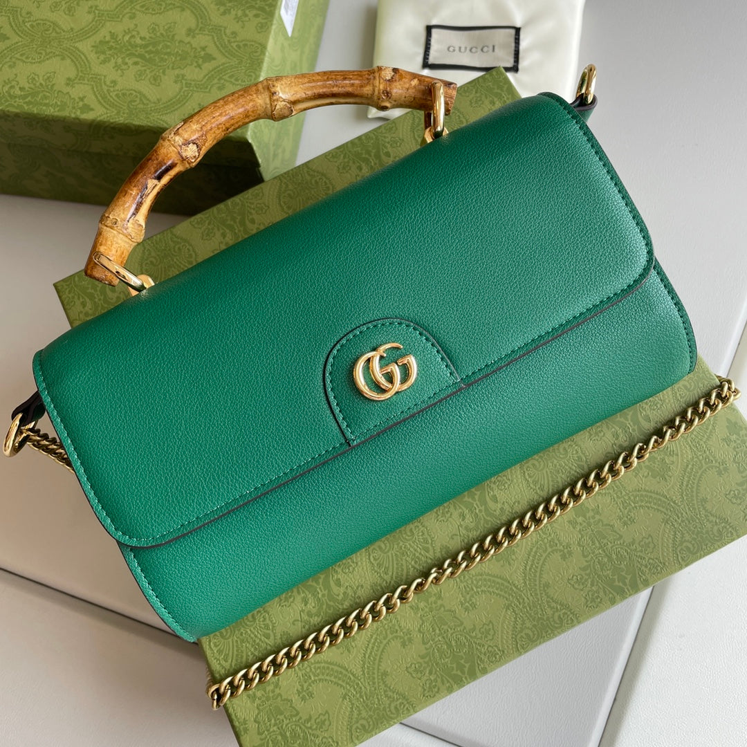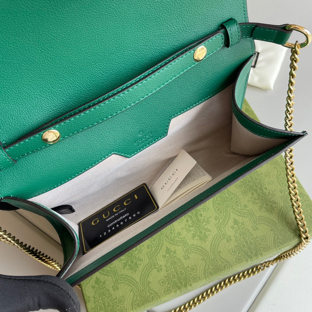 Make a bold yet elegant statement with this Gucci wallet, crafted from rich green leather and finished with the signature gold GG emblem. The natural bamboo top handle adds an artisanal flair, while the gold-toned chain strap offers versatility for shoulder or crossbody wear. Perfect for those who appreciate distinctive design and timeless craftsmanship.