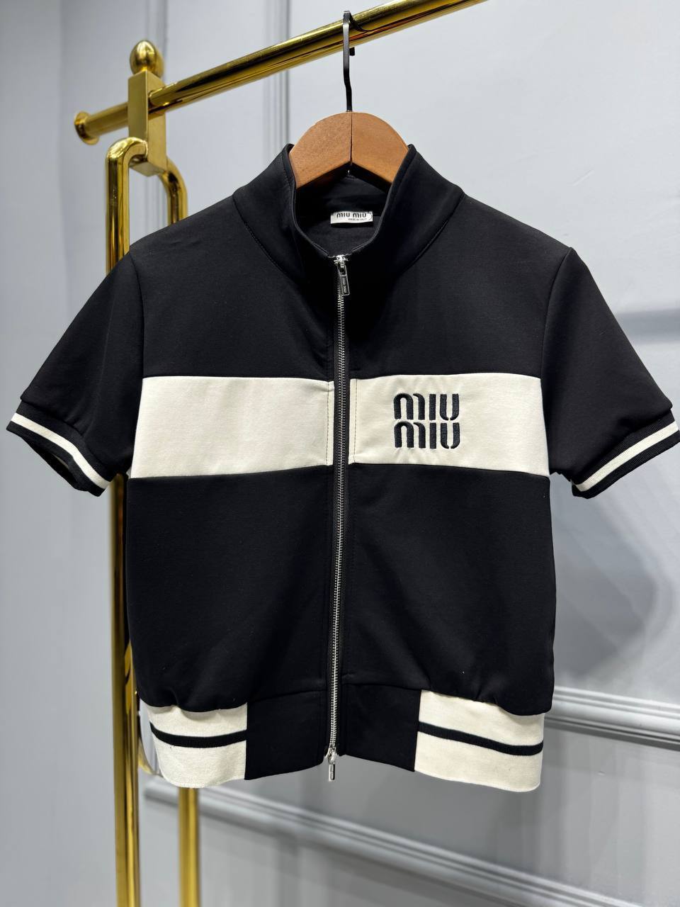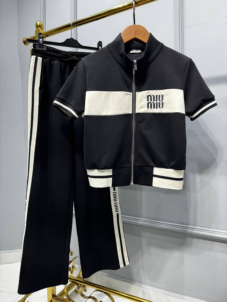 Add a bold touch of sporty elegance to your wardrobe with the Miu Miu Black 2-Piece Set. Designed with a chic short-sleeve zip top and wide-leg pants, this vibrant ensemble captures the essence of modern luxury. Perfect for casual outings, travel, or elevated athleisure looks, it offers both comfort and standout style.