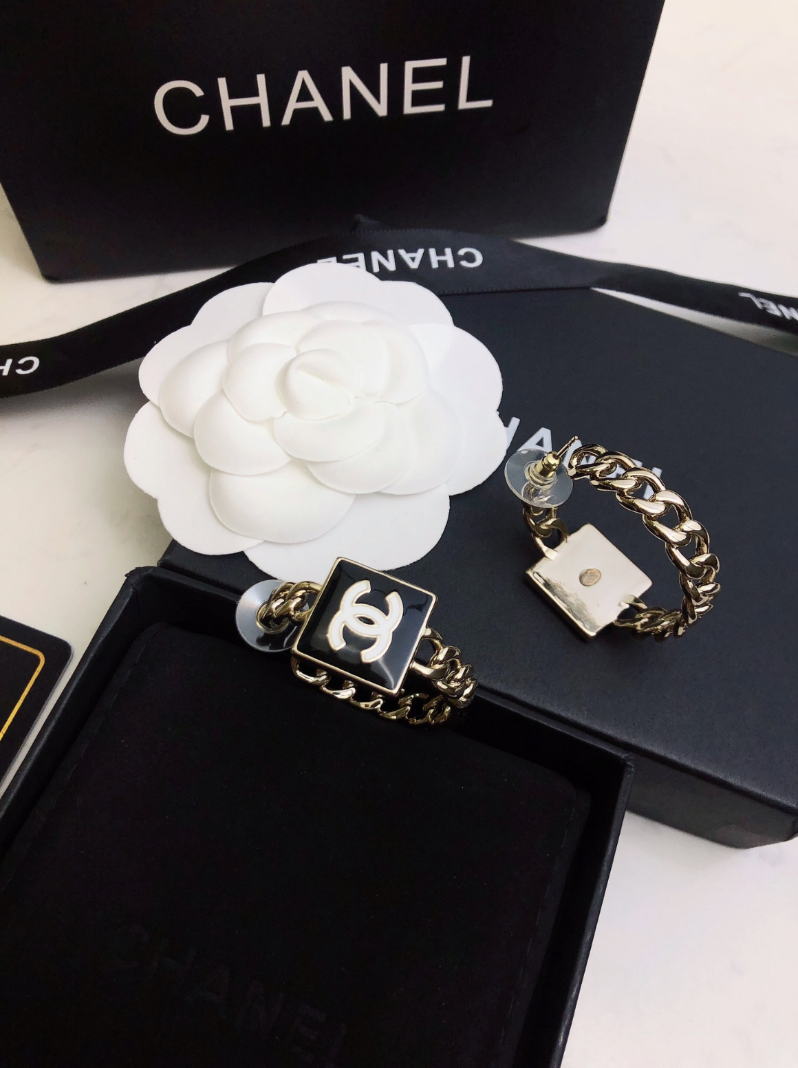 Packaging: Includes Chanel-style box, velvet insert, ribbon, and camellia flower