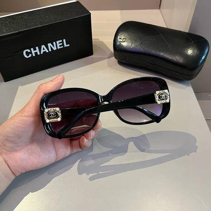 Step into timeless elegance with these Chanel-inspired sunglasses. Crafted with a deep black acetate frame, these oversized sunglasses feature exquisite gold and pearl embellishments framing the iconic Chanel logo on the temples. The gradient lenses provide superior UV protection, making these sunglasses not just a fashion statement but also a functional accessory for everyday luxury.