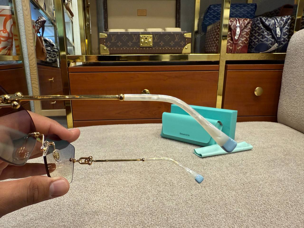 • Logo Detailing: Discreet Tiffany & Co. engraving on lenses and temples