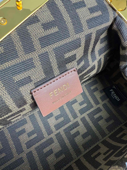 Expertly crafted from premium calfskin leather, this bag features the iconic oversized Fendi metal frame integrated into the design. Its structured yet soft form showcases meticulous stitching and polished details, reflecting the house’s dedication to luxury craftsmanship.
