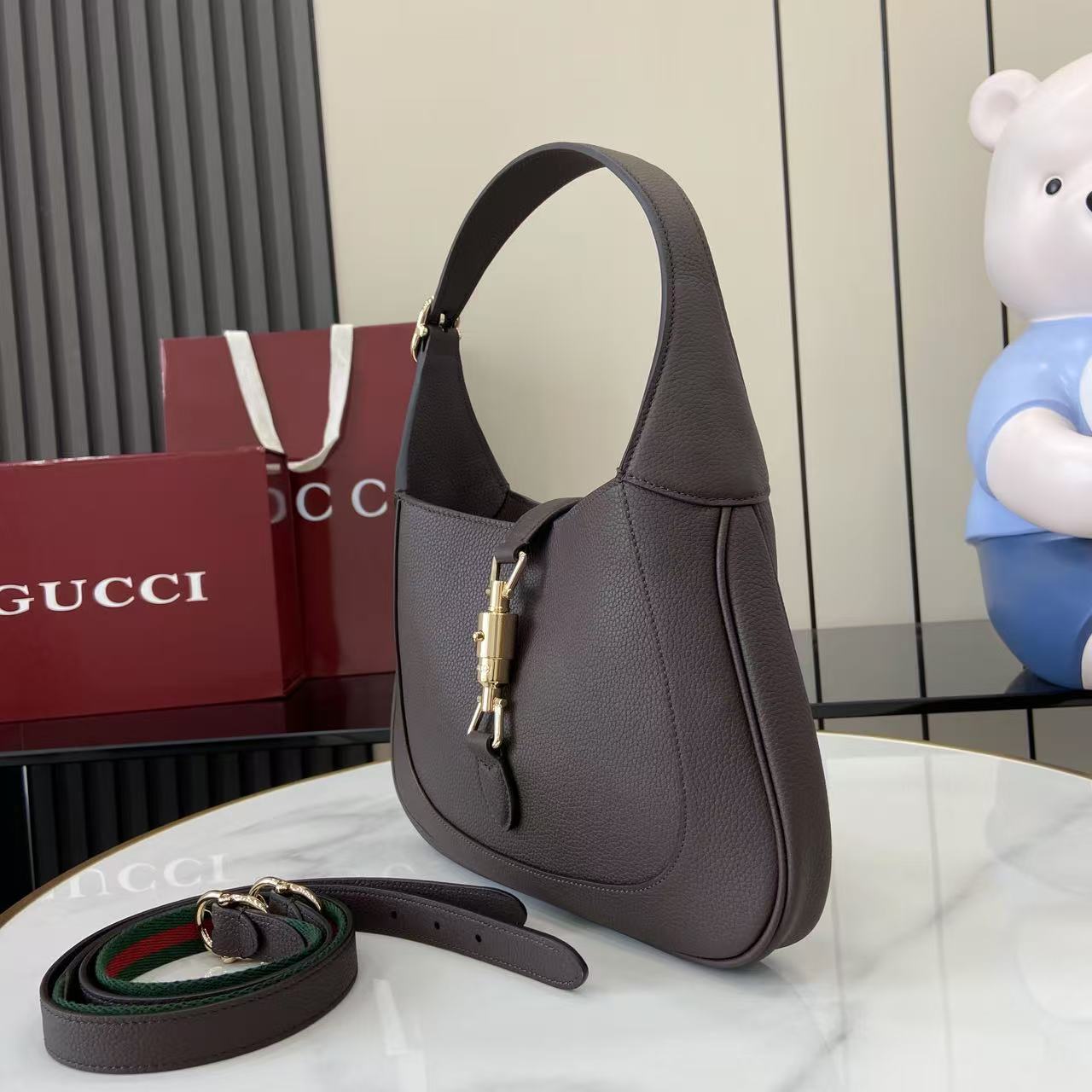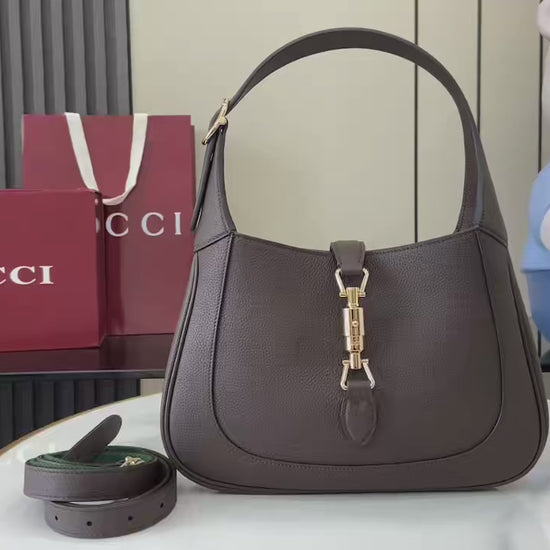 Elevate your wardrobe with the Gucci Jackie 1961 Small Hobo Bag in dark brown grained leather – a true symbol of timeless sophistication and iconic Gucci design. ✨