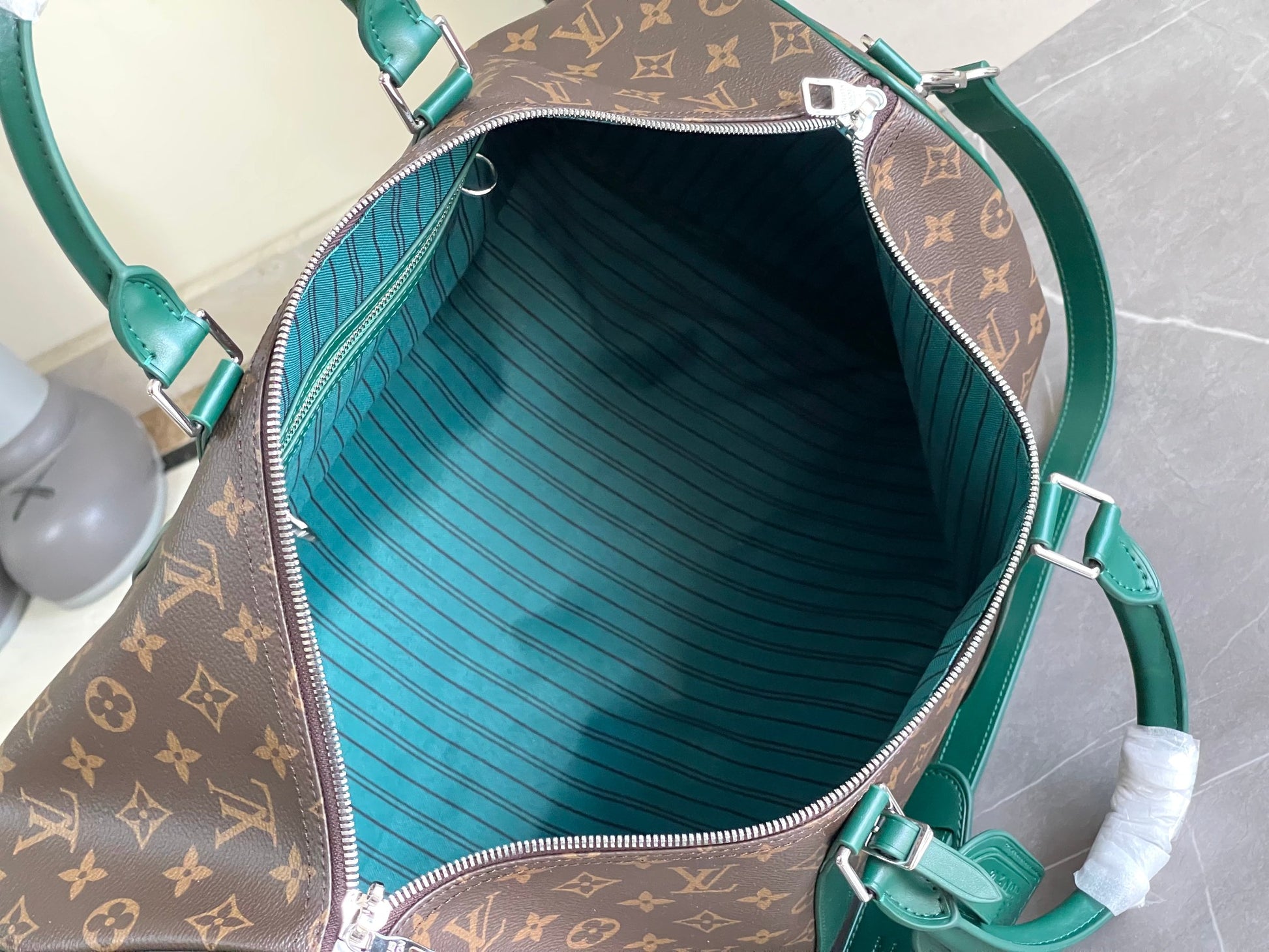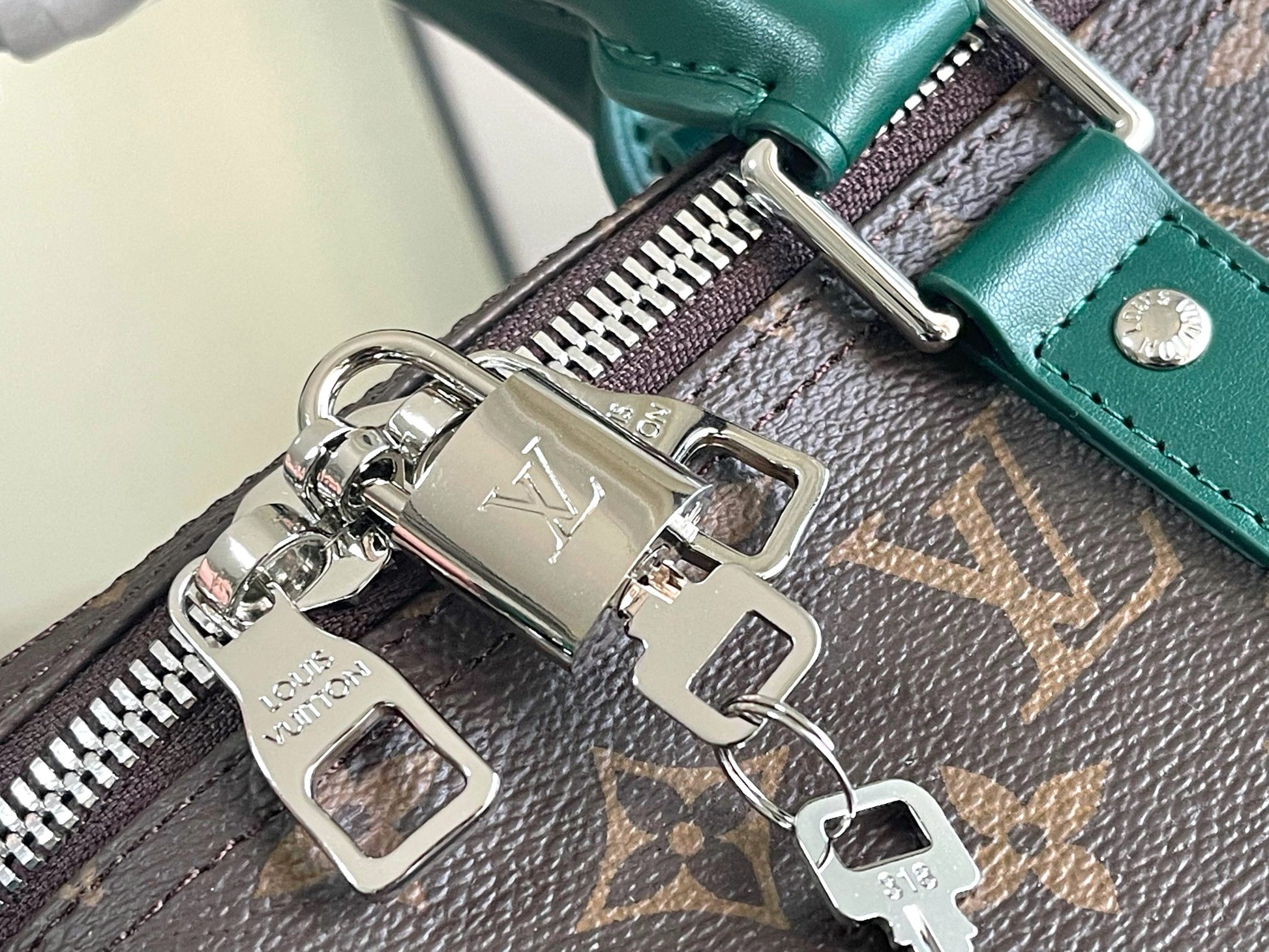 This Keepall Bandoulière 50 is the ideal balance between classic LV heritage and modern flair. The elegant green accents bring a refreshing twist, making it a versatile piece for any journey while ensuring you stand out with sophistication.