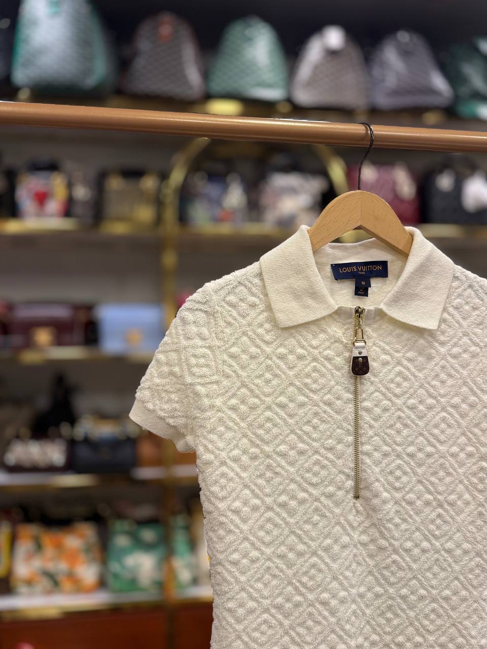 This chic polo dress is crafted from plush cotton-wool blend toweling that is discreetly signed all over with Monogram Flowers in relief and finished with ribbed hems. It is crafted in a casual short-sleeved shape with a sporty flat collar and a golden zipper on the chest, which is trimmed with a Monogram canvas pull.