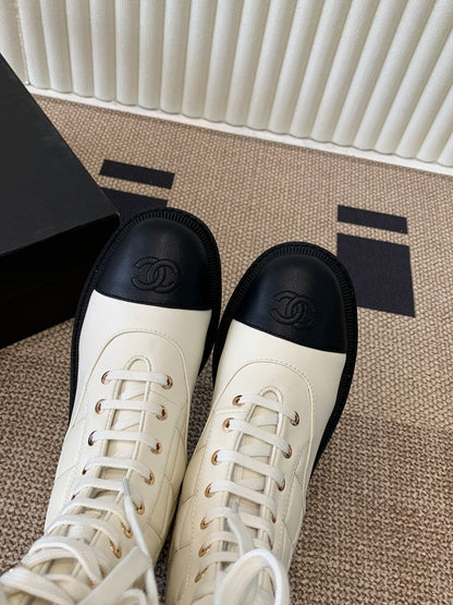 Step into refined rebellion with these Chanel-inspired ivory lace-up boots, a bold reimagining of classic Parisian elegance. With buttery-soft white leather, sharp black toe caps, and polished gold eyelets, these boots make a statement with every step.