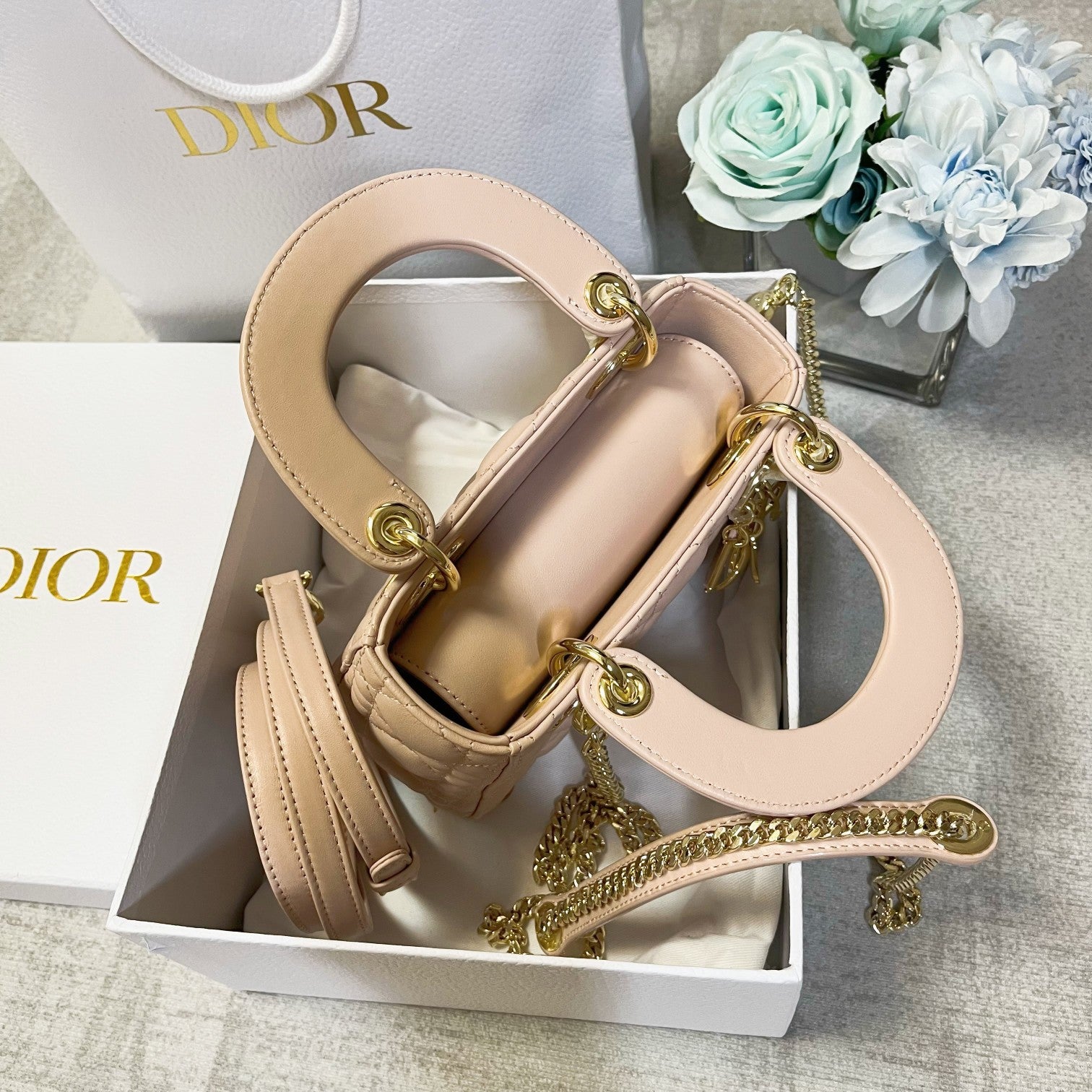 Perfect for refined daywear or an elegant evening out, this micro Lady Dior is the ideal companion for essentials. Its gentle blush tone complements both casual and formal looks, making it a versatile and charming piece in any wardrobe.