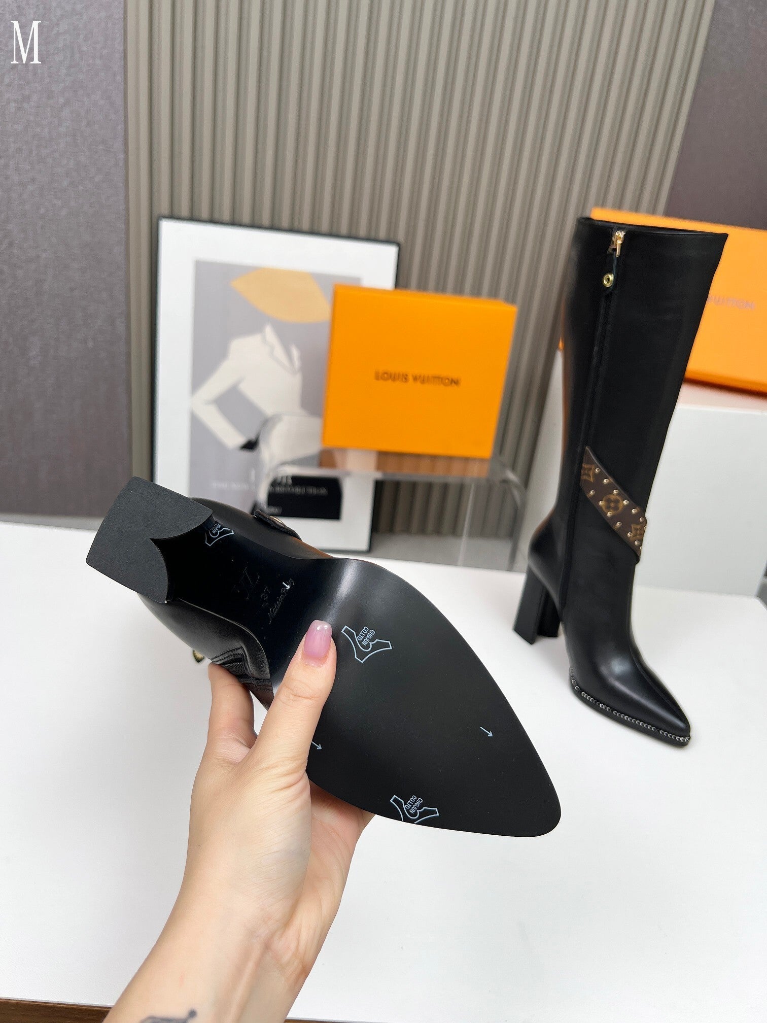 These knee-high boots capture the essence of Louis Vuitton elegance with a modern edge. The blend of supple leather, textured knit, and gold chain detailing creates a bold yet sophisticated look that complements dresses, skirts, or tailored coats.