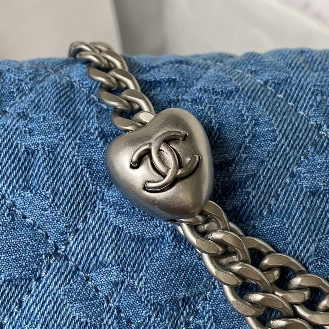Crafted from premium quilted denim fabric, this Chanel bag showcases meticulous stitching and superior craftsmanship. The silver-tone CC turn-lock and heart-shaped charm add an extra layer of iconic appeal.