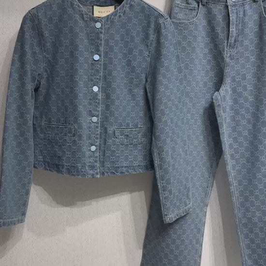 This Gucci denim set offers a refined take on casual wear, combining the brand’s timeless GG monogram pattern with a versatile silhouette. The collarless jacket features a clean button-up front and two welt pockets, while the straight-leg jeans provide a classic fit that pairs perfectly with the top for a coordinated look. Wear them together for a bold statement or separately to create endless styling possibilities.