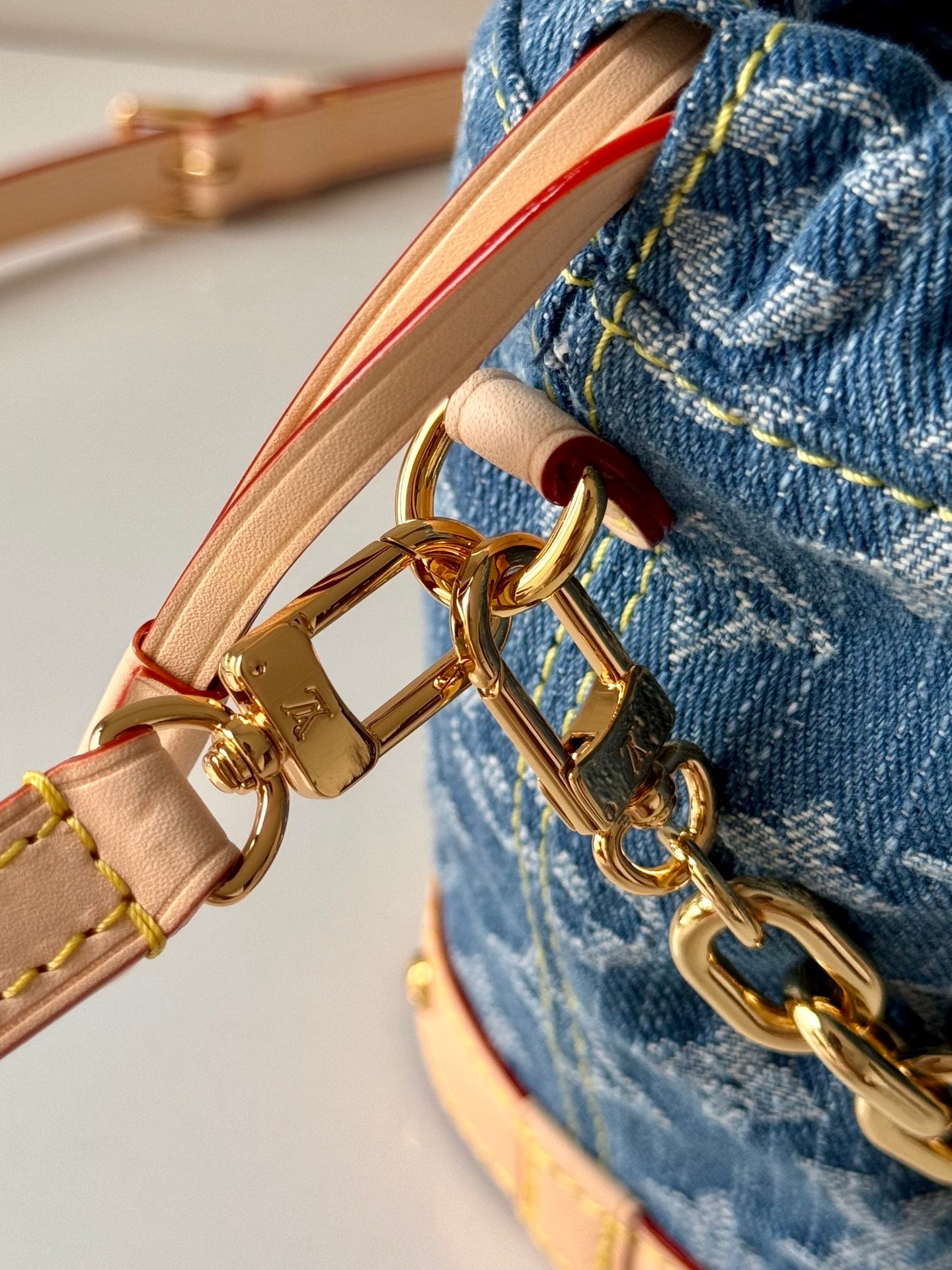 Add a fresh and youthful twist to your collection with the Louis Vuitton Nano Noé Denim Monogram Bucket Bag — compact luxury with a bold statement.