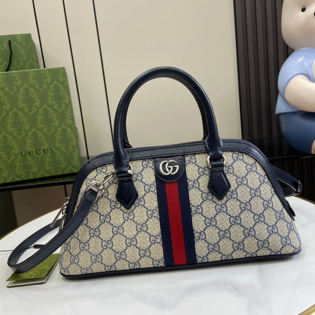 The Ophidia Mini Top Handle Bag reinterprets classic Gucci elements with modern charm. Crafted from beige/ebony GG Supreme canvas, it features the iconic blue and red Web stripe, gold-tone GG hardware, and navy leather trim. Compact yet functional—perfect for everyday elegance.