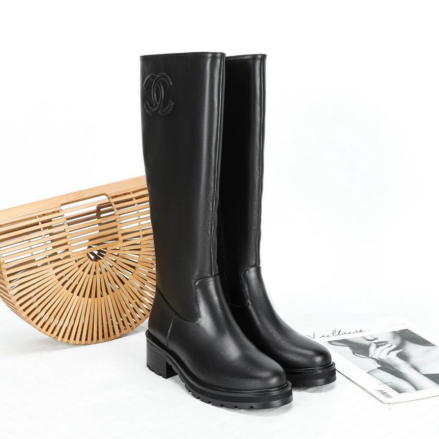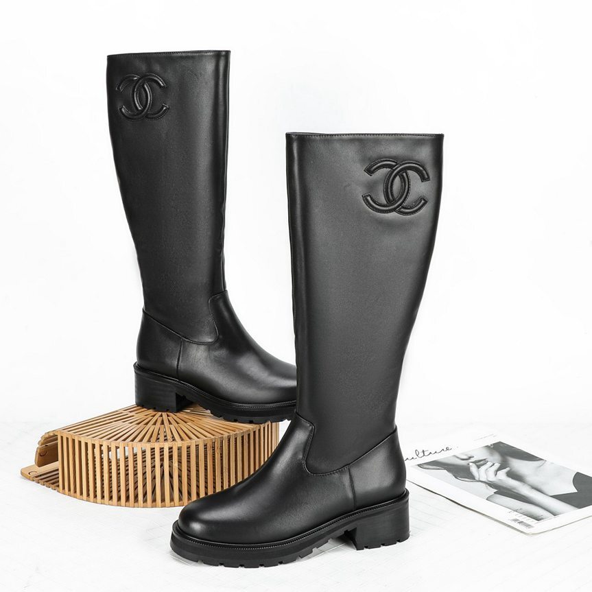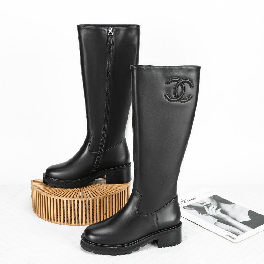 Knee-High Boots: Soft calf leather with tonal embossed CC logo and comfortable sole.