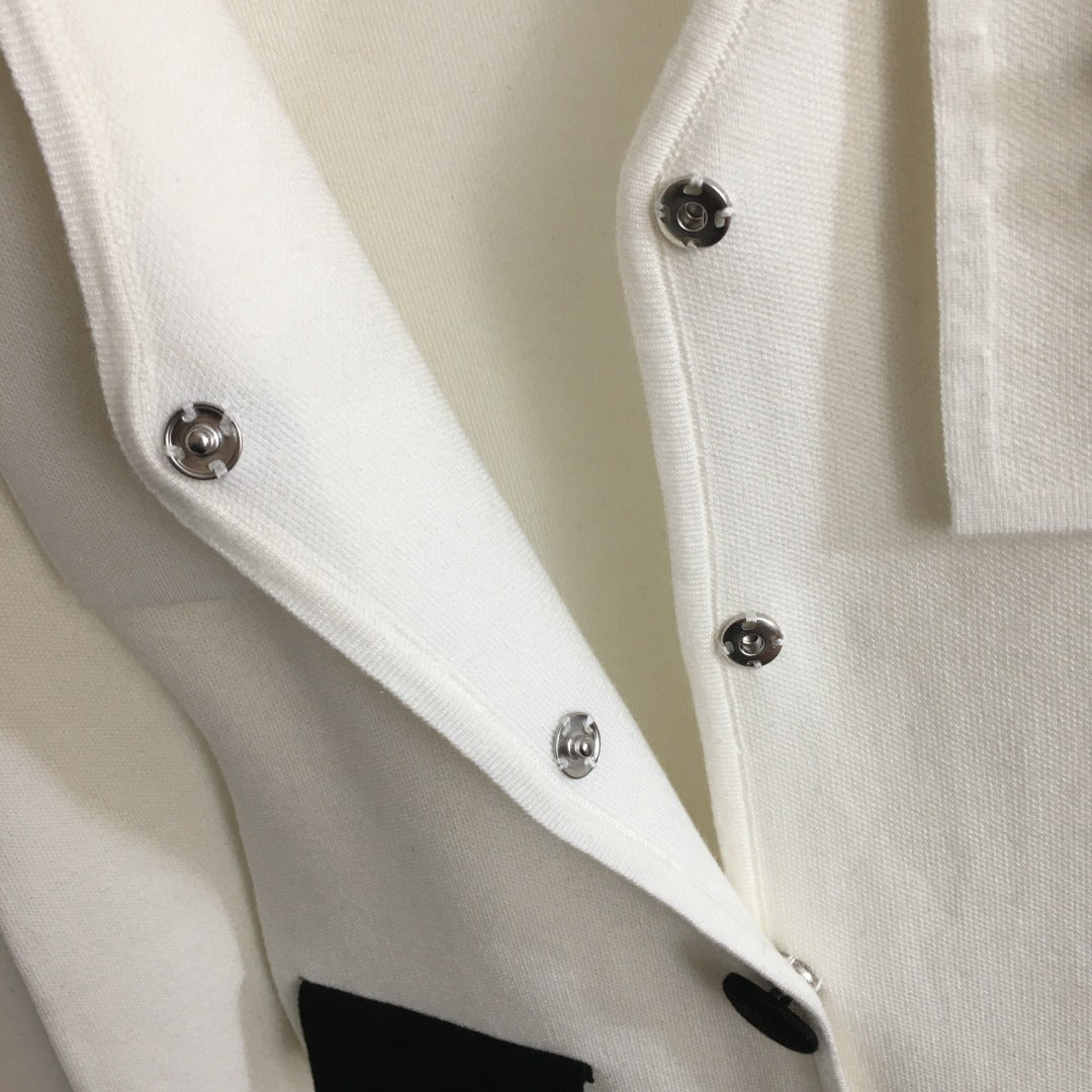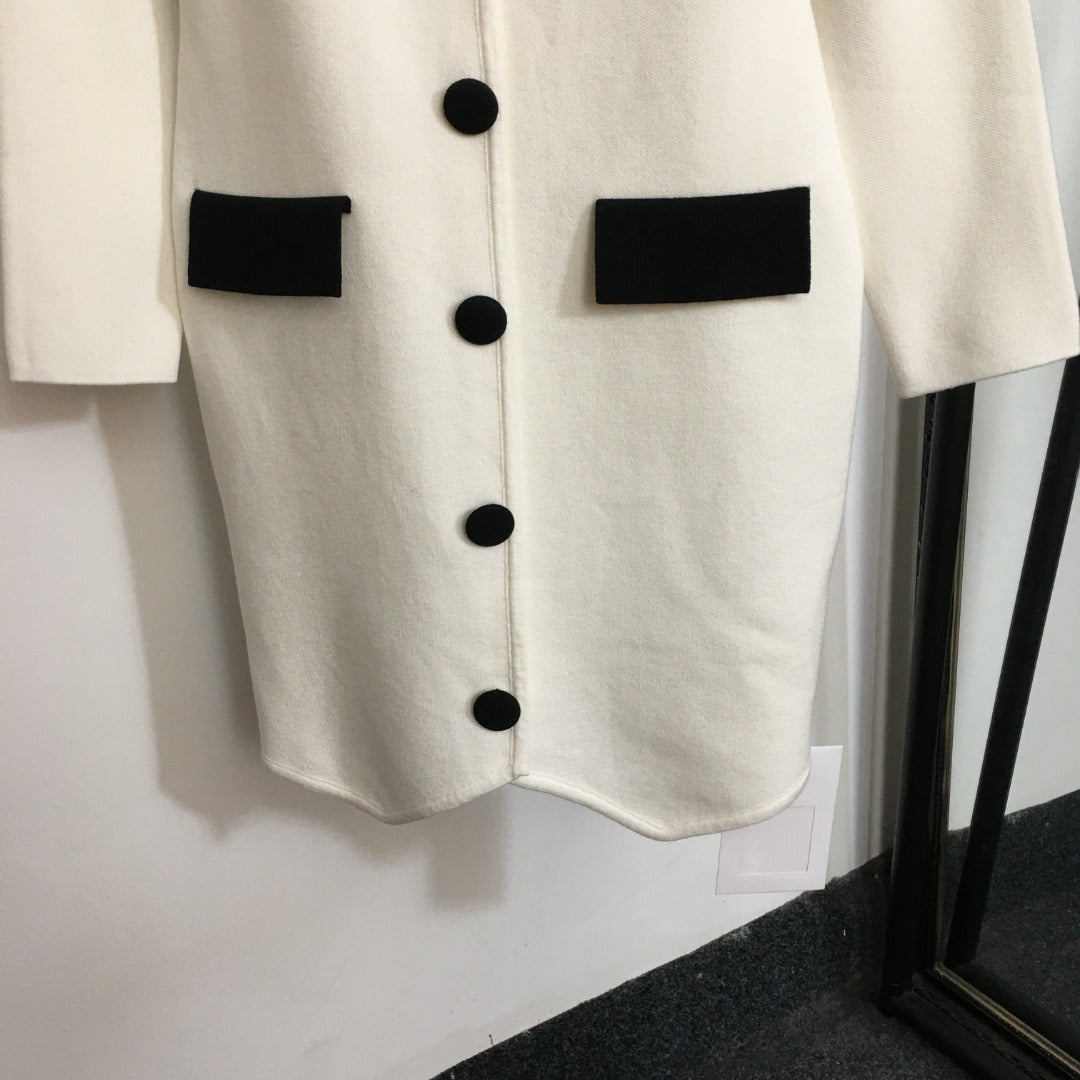 Wool Coat: Tailored silhouette with contrasting black collar and pockets for a refined finish.