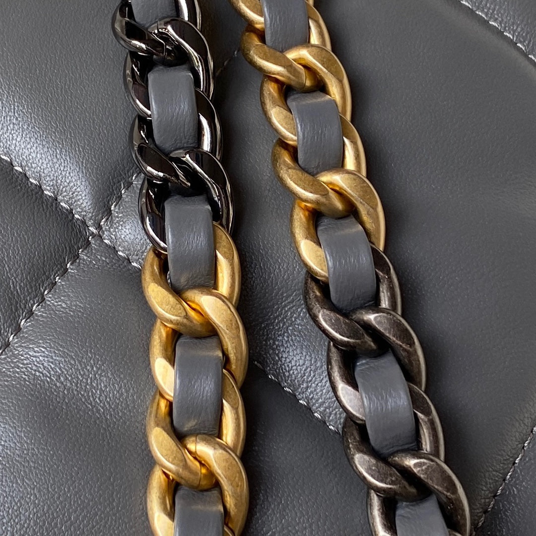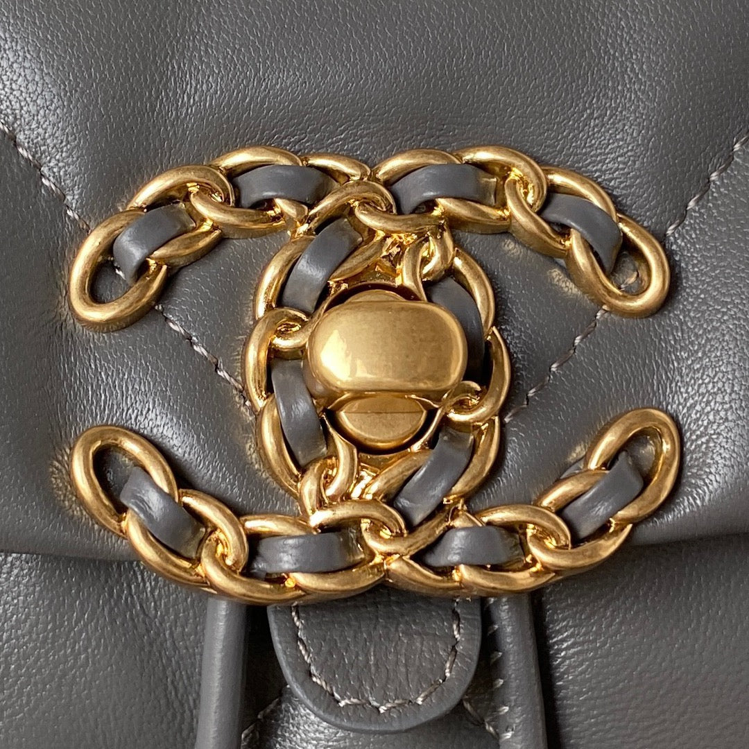 Step into timeless sophistication with this gray Chanel 19 Backpack — a luxurious and powerful addition to any collection.
