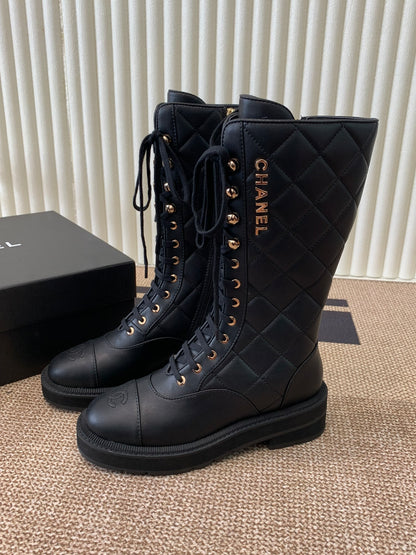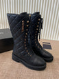 Step into timeless elegance with these Chanel-inspired combat boots featuring a matte black finish, luxurious quilted design, and a bold side metal CHANEL detail. Designed to blend functionality with iconic fashion, these boots are perfect for making a confident statement.