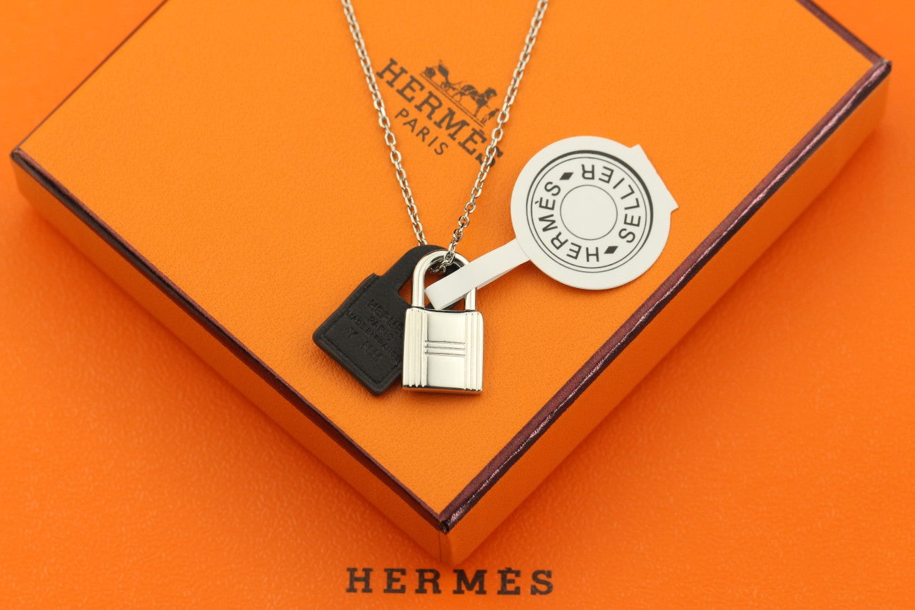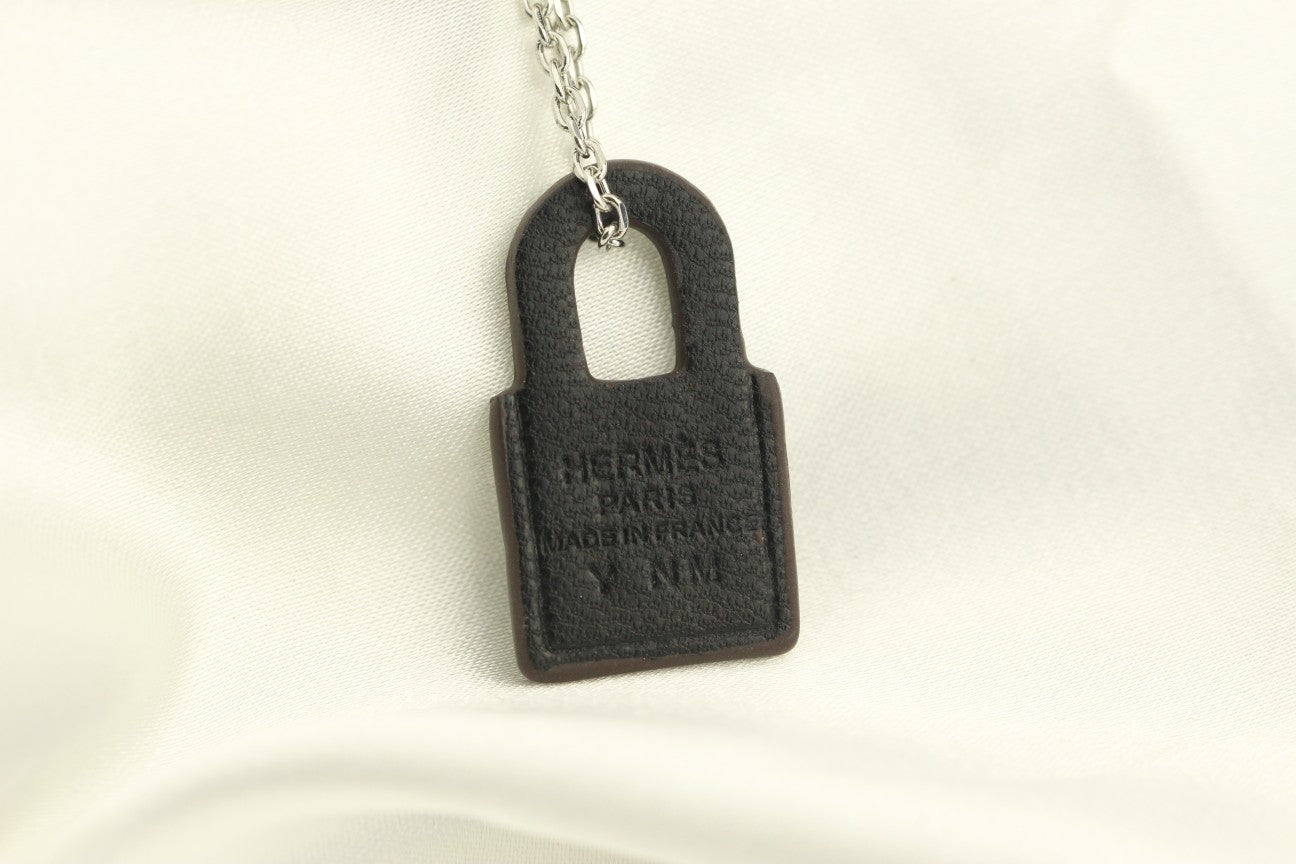 A fusion of minimalism and bold charm. This necklace features a black leather padlock charm paired with a white Hermès Sellier-style medallion on a sleek silver-tone chain — blending classic Hermès codes with a modern edge.