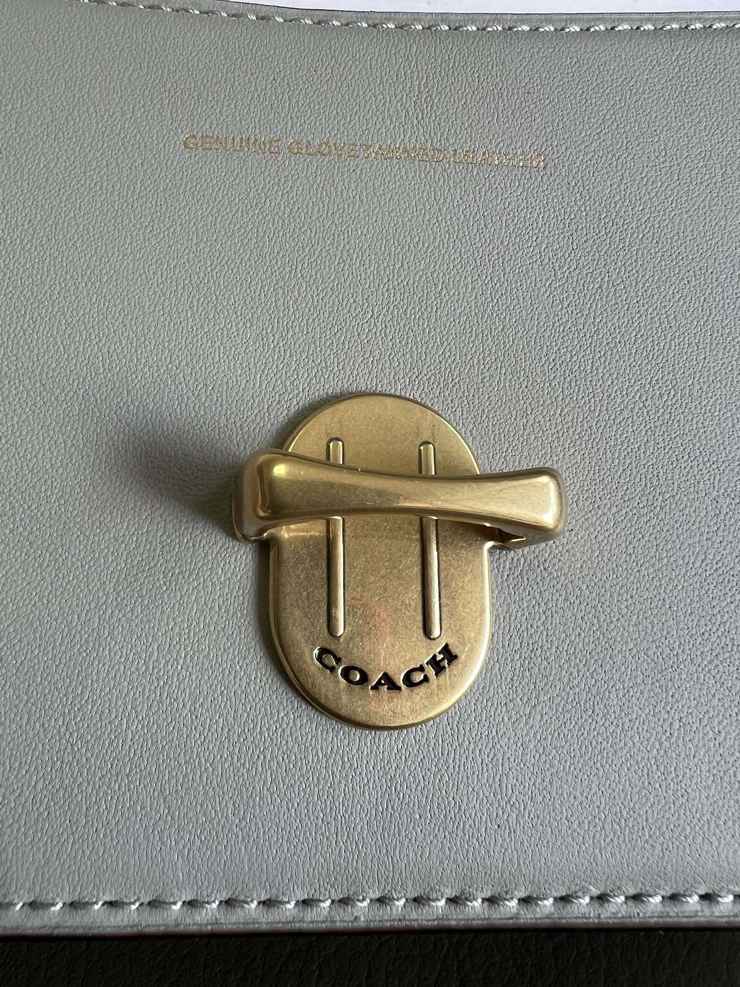 The Coach Studio 19 Shoulder Bag in white smooth leather embodies timeless sophistication with a refined silhouette. Its structured form, polished gold “C” turn-lock closure, and matching topstitch details create a perfect balance between modern elegance and classic charm. Designed for both day and evening wear, this piece elevates any look with its understated luxury.