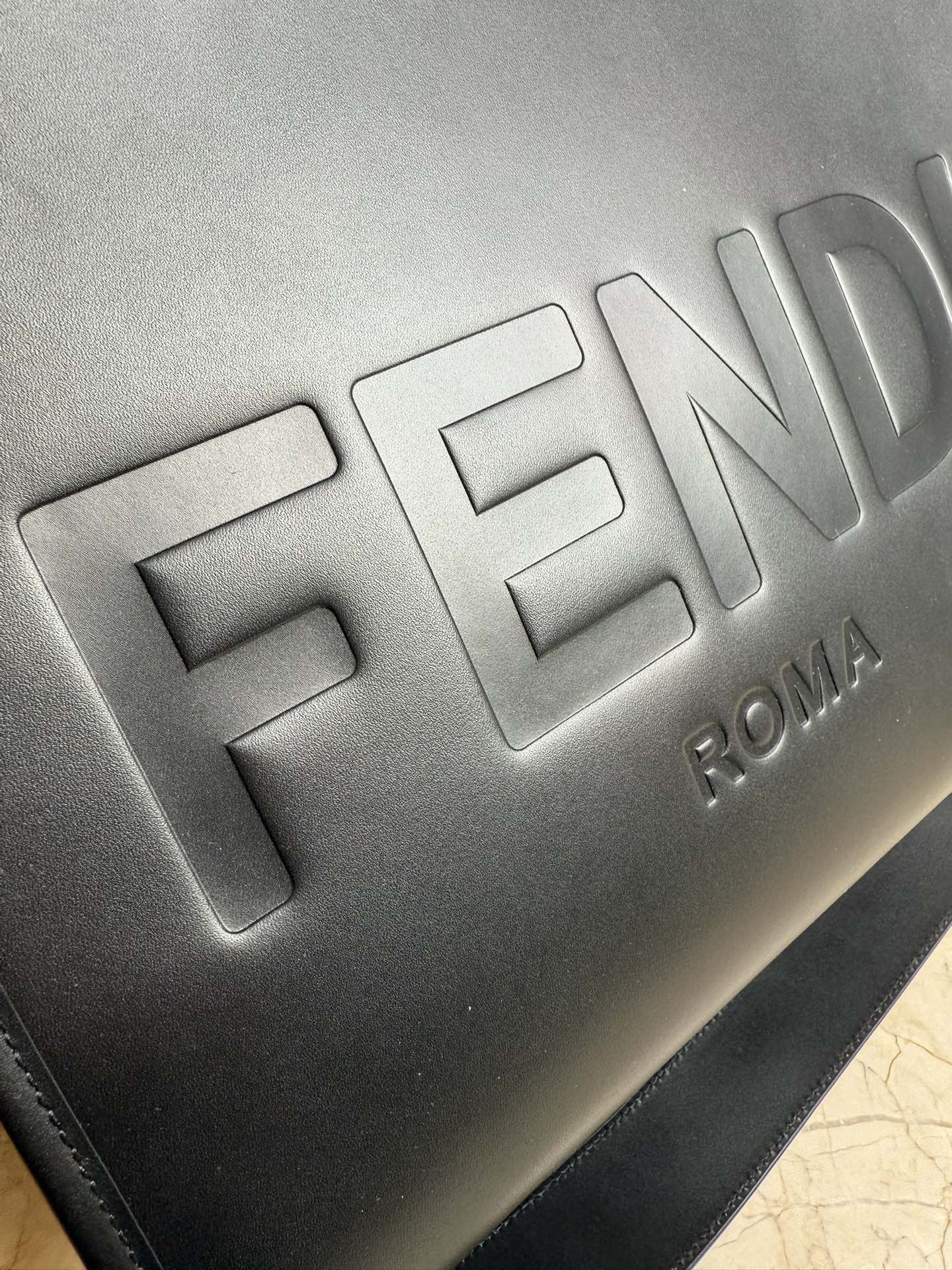 Expertly crafted from premium calfskin leather, the Sunshine Tote is distinguished by its structured silhouette and large embossed FENDI ROMA logo. The sleek construction, reinforced stitching, and sturdy handles ensure long-lasting durability.