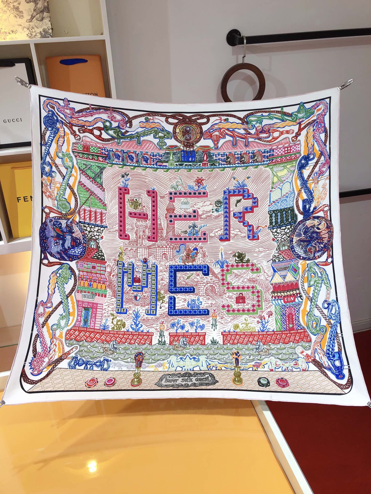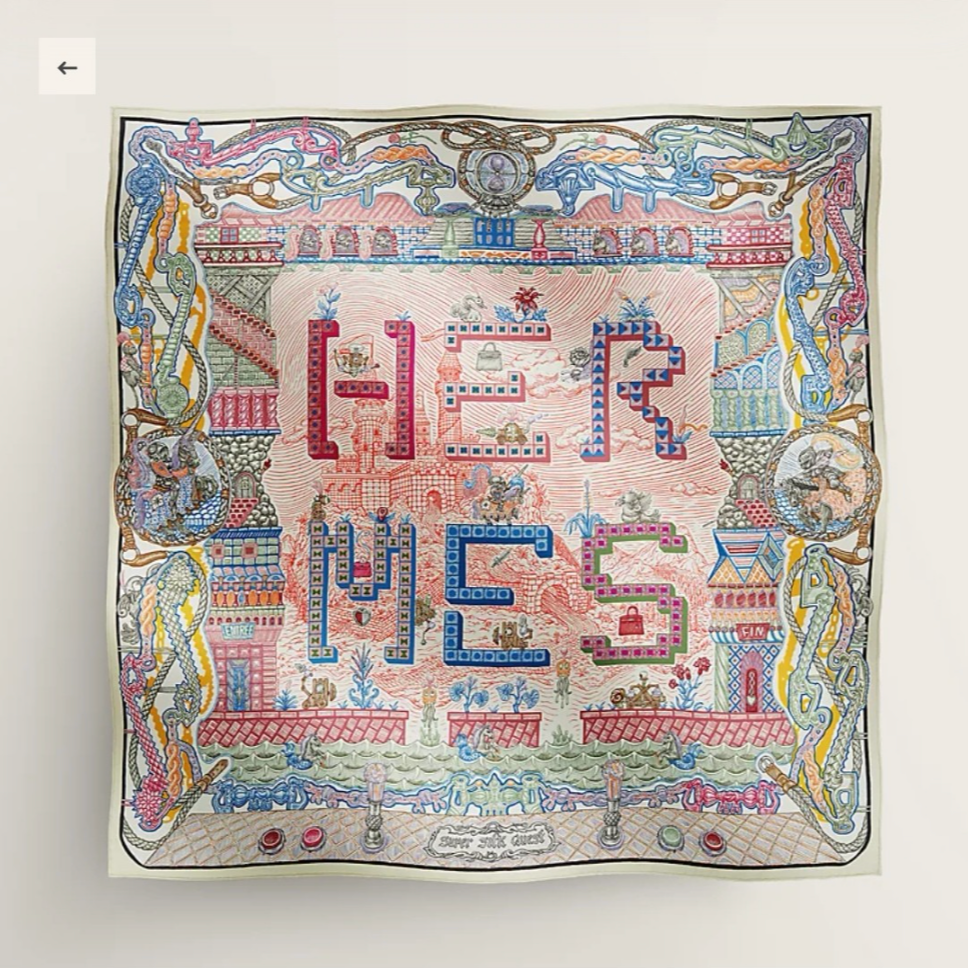Enter a whimsical world of imagination and storytelling with the Hermès Super Silk Quest Scarf 90. This extraordinary creation invites you to explore a digital fantasy filled with playful patterns, mythical creatures, and vibrant architectural elements — all while showcasing the bold HERMÈS name in pixelated artistry.