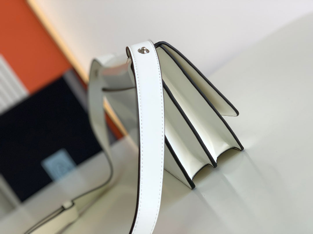 This structured shoulder bag blends retro charm with contemporary polish. Its clean lines, metallic triangle plaque, and glossy leather finish create a refined look that transitions seamlessly from day to night.