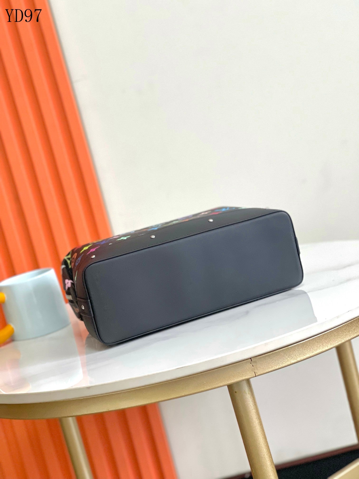 Durable black coated canvas with vibrant multicolor monogram print