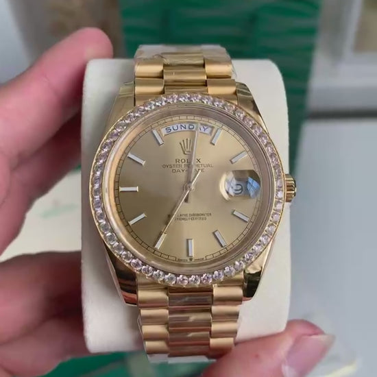 Designed to impress, this Rolex Day-Date–inspired watch showcases a full gold-tone finish, fluted bezel, and radiant diamond-style hour markers. A timeless 36mm piece that blends classic design with everyday luxury.