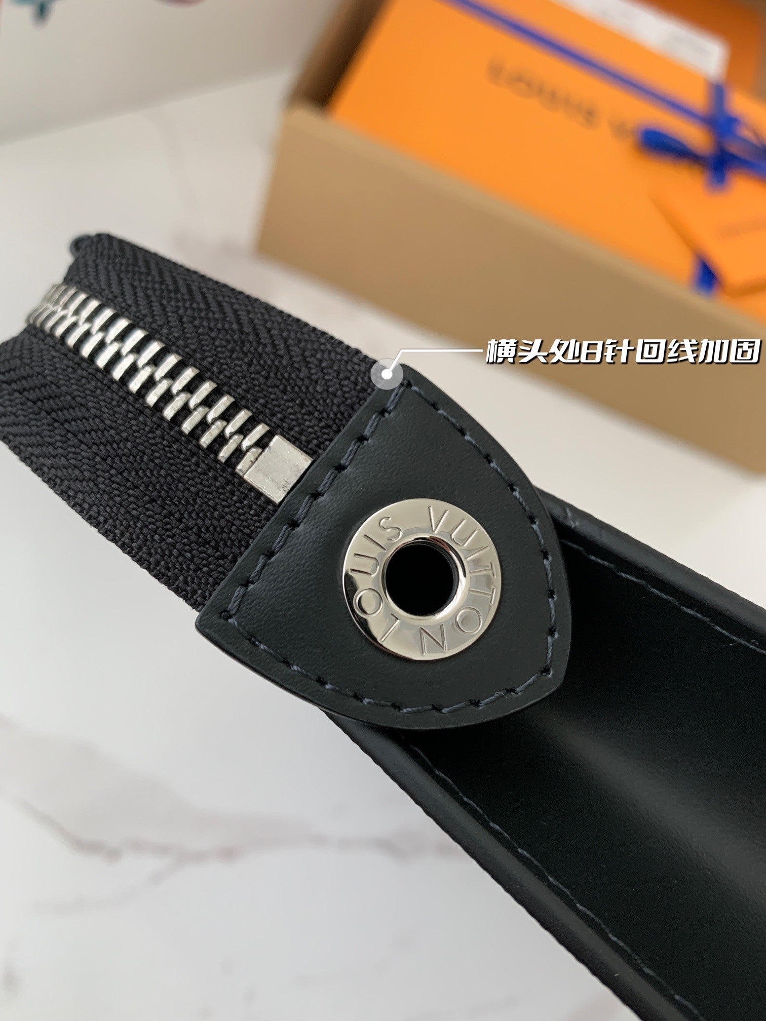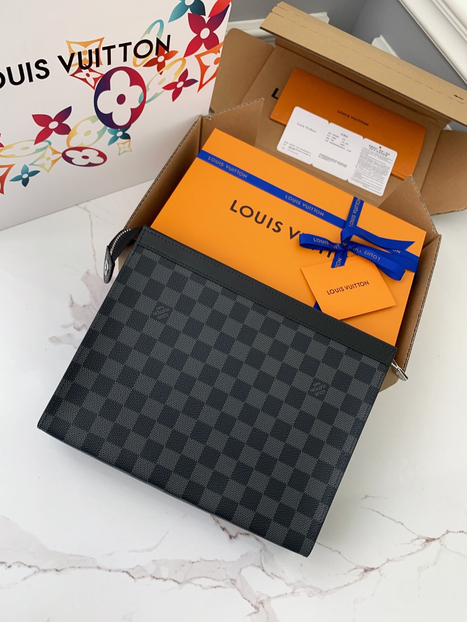 Add a touch of sophistication to your daily essentials with this sleek and modern Louis Vuitton-inspired Pochette Voyage clutch. Crafted in iconic Damier Graphite canvas, it offers a bold and refined look, making it the perfect accessory for the modern gentleman on the move.