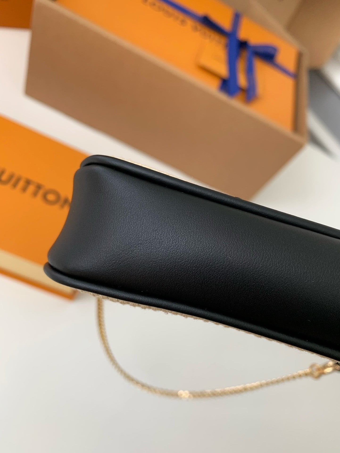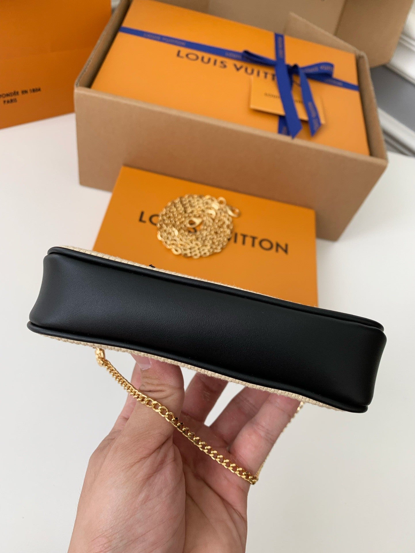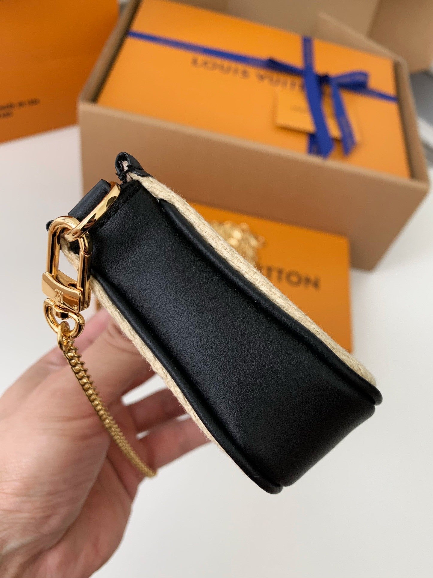 This Louis Vuitton Mini Pochette is crafted from high-quality Lafite cotton with eye-catching black monogram embroidery that exudes modern elegance. A sleek gold-tone chain adds a touch of luxury while offering versatile styling options – carry it as a chic clutch or wear it as a statement mini shoulder bag. Compact yet impactful, it’s the perfect companion for stylish essentials.