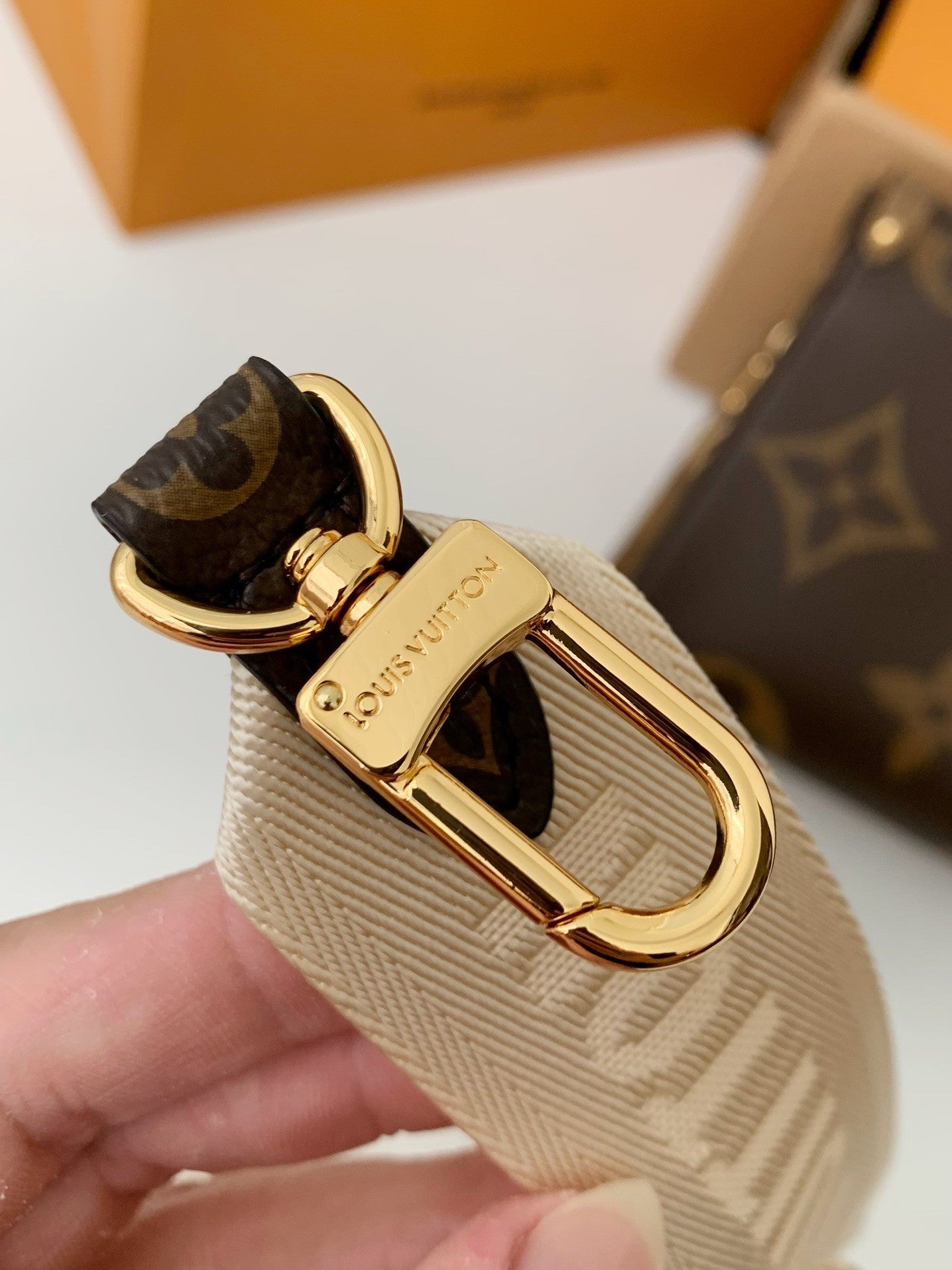 Includes wide canvas shoulder strap with embossed “Louis Vuitton” lettering